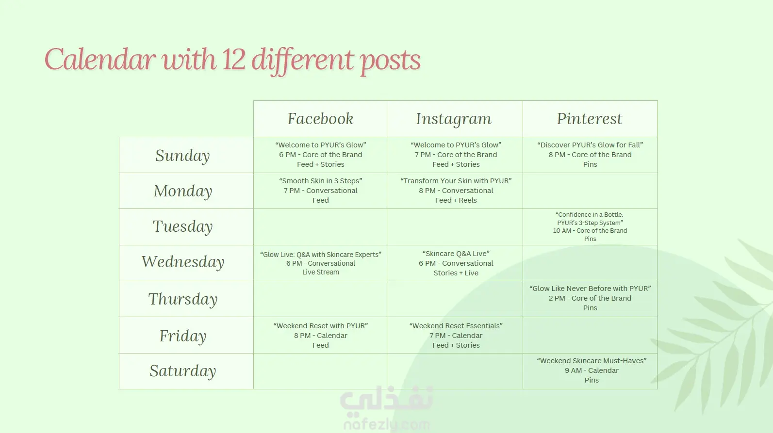 - إنشاء جدول نشر (Posting Calendar) ومقترحات محتوى شهرية لبناء تفاعل مستمر مع الجمهور.