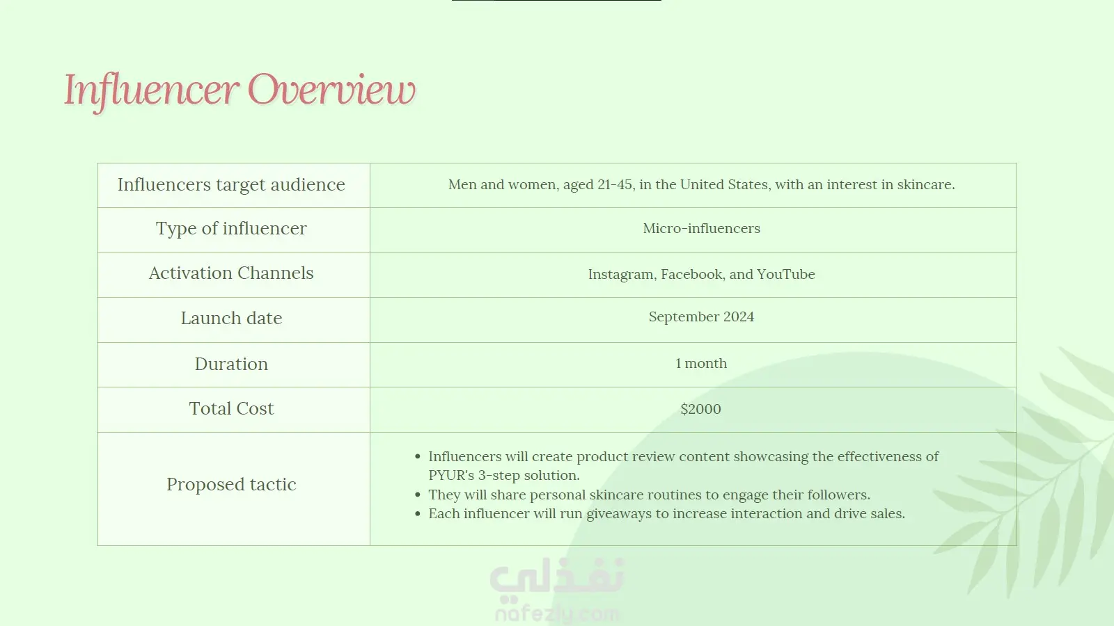 - إعداد خطة مؤثرين (Influencer Marketing Plan) مع تخصيص الميزانية لكل فئة.