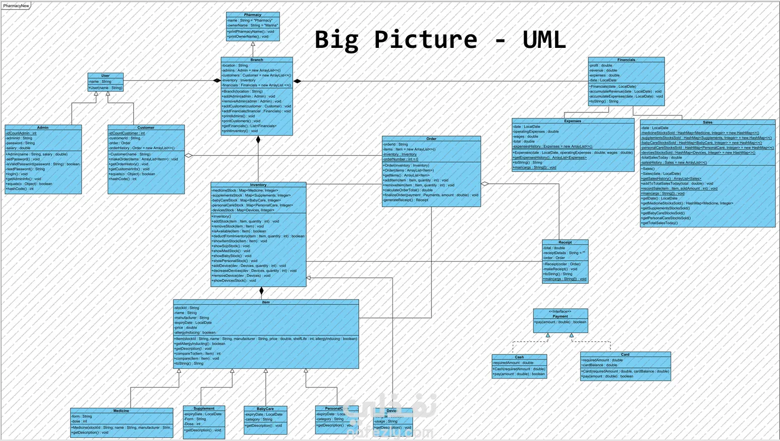 A desktop application that simplifies pharmacy operations by managing medicines, customers, and invoices in one place. It features a clean JavaFX interface that makes it easy to add, edit, delete, and search records, helping pharmacists manage their work efficiently. The project also includes a UML diagram illustrating the system’s structure and relationships between components. نظام إدارة صيدلية (Java & JavaFX) تطبيق desktop يسهّل إدارة الصيدلية من خلال تنظيم الأدوية، العملاء، والفواتير في مكان واحد. يتميز بواجهة رسومية بسيطة تسهّل إضافة، تعديل، حذف، والبحث عن السجلات، مما يساعد الصيدلي على إدارة عمله بكفاءة. يتضمّن المشروع أيضًا مخطط UML يوضّح بنية النظام والعلاقات بين مكوّناته.