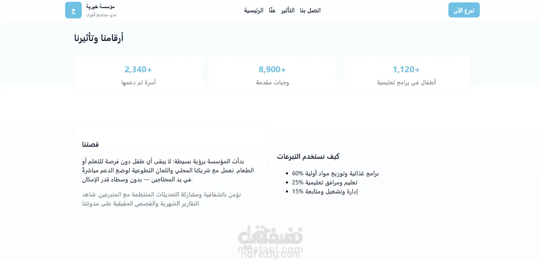 قمت بتطوير موقع صفحة هبوط بعنوان Charity Landing Page لمؤسسة خيرية تسعى إلى جمع التبرعات ودعم الأطفال والأُسر المحتاجة. يحتوي الموقع على أقسام رئيسية مثل «الرئيسية»، «عنّا»، «التأثير»، و«اتصل بنا»، إضافةً إلى زرّ واضح لـ«تبرّع الآن» يُسهّل عملية التبرّع. يُعرض الموقع الأهداف والأرقام التأثيرية مثل عدد الأسر المدعومة والوجبات المقدّمة، مع محتوى يعكس الشفافية والالتزام. تمّ تطويره باستخدام HTML، CSS، وJavaScript، مع تصميم متجاوب يعمل بشكل ممتاز على مختلف الأجهزة، وبواجهة مستخدم بسيطة وواضحة. كما قمت بتصميم وتطوير الموقع من الصفر مع التركيز على تحويل الهدف الخيري إلى تجربة رقمية فعّالة وجذّابة.