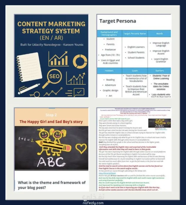 • بناء نظام تسويق بالمحتوى متكامل: دراسة الجمهور + Buyer Persona + رسالة تحريرية واضحة وقيمة مضافة.