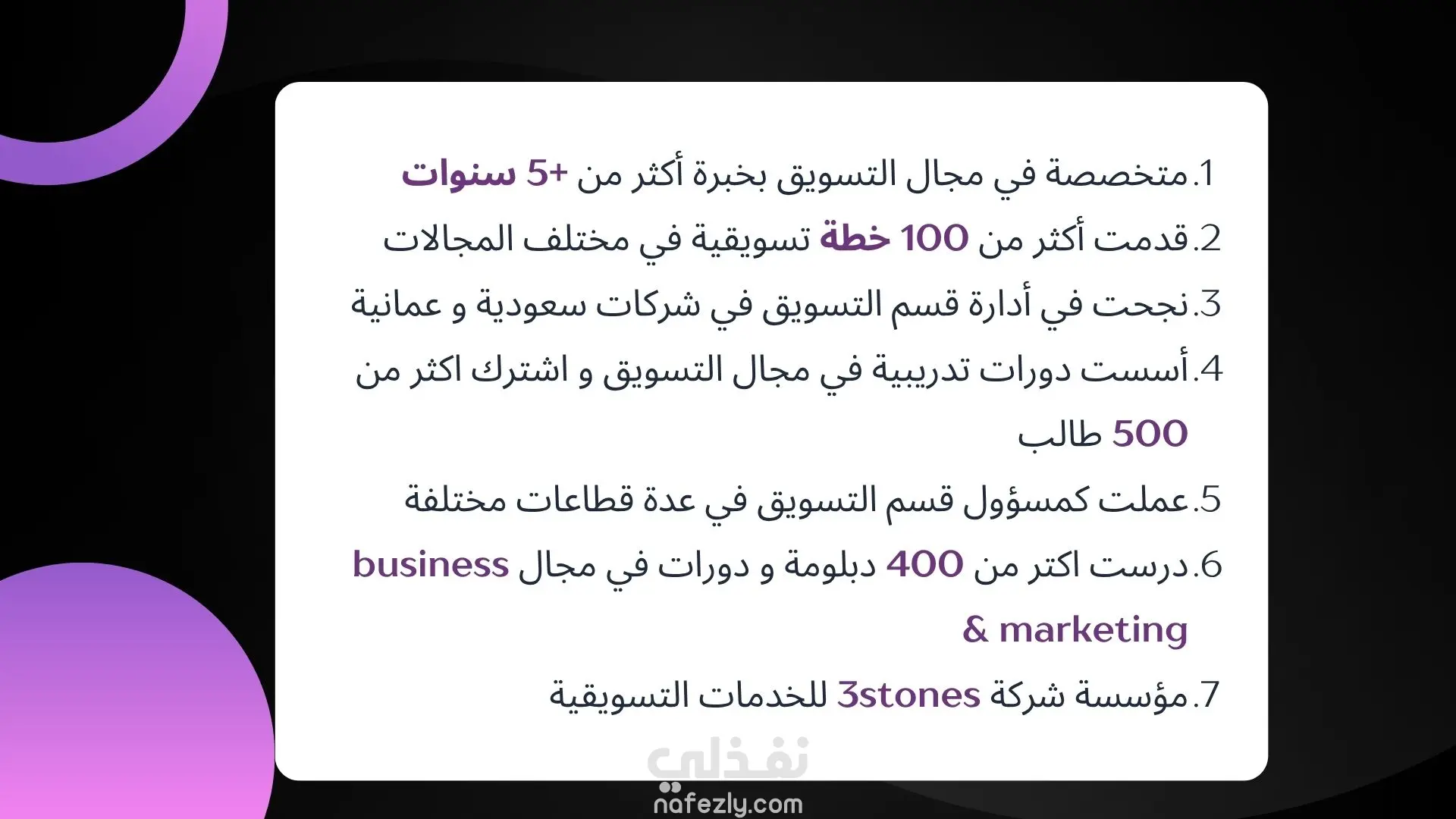 بعد خبرة عميقة في إعداد أكثر من 200 خطة تسويقية، لمستُ التحديات المتكررة التي تواجه أصحاب المشاريع. الخطط المتداولة غالبًا ما تكون سطحية، تفتقر للتفاصيل الجوهرية، وتُركز حصريًا على السوشيال ميديا مع تجاهل عناصر تسويقية أكثر أهمية وأولوية. كما أن الأفكار المطروحة كثيرًا ما تكون أكاديمية وغير واقعية، بعيدة عن تطبيقات السوق الفعلية، ويغيب عنها التحليل التسويقي العميق. الأهم من ذلك، يغيب عنصر المتابعة أثناء التنفيذ، ما يُفشل الخطة مهما كانت جودتها النظرية. لذا، أقدّم خططًا تسويقية شاملة ودقيقة، تتكوّن من 70 عنصرًا تسويقيًا موزعة على 40 صفحة. نعمل خلالها على تطوير مشروعك بخطوات عملية وواضحة. التزامي لا يتوقف عند التسليم، بل يشمل المتابعة الشخصية والإشراف على التنفيذ. سأقوم بتدريبك على فهم وتطبيق البنود، لتتمكن من امتلاك زمام مشروعك والسير به بنجاح بعد انتهاء التعاون. ملاحظة: هذه الخدمة ليست خطة سوشيال ميديا (فهي مجرد عنصر واحد)، بل هي استشارة متكاملة وعميقة لعميل يستحق تحقيق الأفضل. مميزات الخدمة السرعة في الاستلام إنجاز وتسليم الخطة في وقت قياسي 3 أيام دون التأثير على الجودة أو التفاصيل الدقة في البحث كل نقطة مدروسة بعناية مبنية على تحليل واقعي ومعطيات حقيقية عن السوق والمنافسين فهم متطلبات العميل جيداً يتم تصميم الخطة وفقًا لطبيعة نشاطك وأهدافك الخاصة، لا بطريقة عامة أو جاهزة. التجربة ما قبل الدفع يمكنك الاطلاع على نموذج تجريبي قبل الالتزام، لتتأكد بنفسك من القيمة والجودة التي ستحصل عليها.