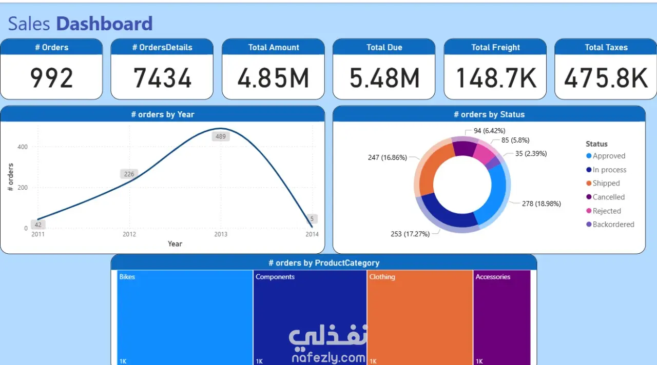 لوحة تحكم تفاعلية تم تصميمها على Power BI لعرض وتحليل مؤشرات الأداء الرئيسية للمبيعات بشكل واضح وسهل الفهم. المخرجات والتحليلات: إجمالي عدد الطلبات وقيم المبيعات والضرائب والشحن. تحليل اتجاه المبيعات حسب السنوات. توزيع الطلبات حسب الحالة (تمت الموافقة، قيد المعالجة، تم الشحن، إلخ). تحليل المبيعات حسب فئات المنتجات (دراجات، مكونات، ملابس، إكسسوارات). تصميم احترافي بسيط يتيح الوصول السريع إلى أهم المؤشرات. اللوحة تساعد في متابعة الأداء واتخاذ قرارات مبنية على البيانات بشكل دقيق وفعّال.
