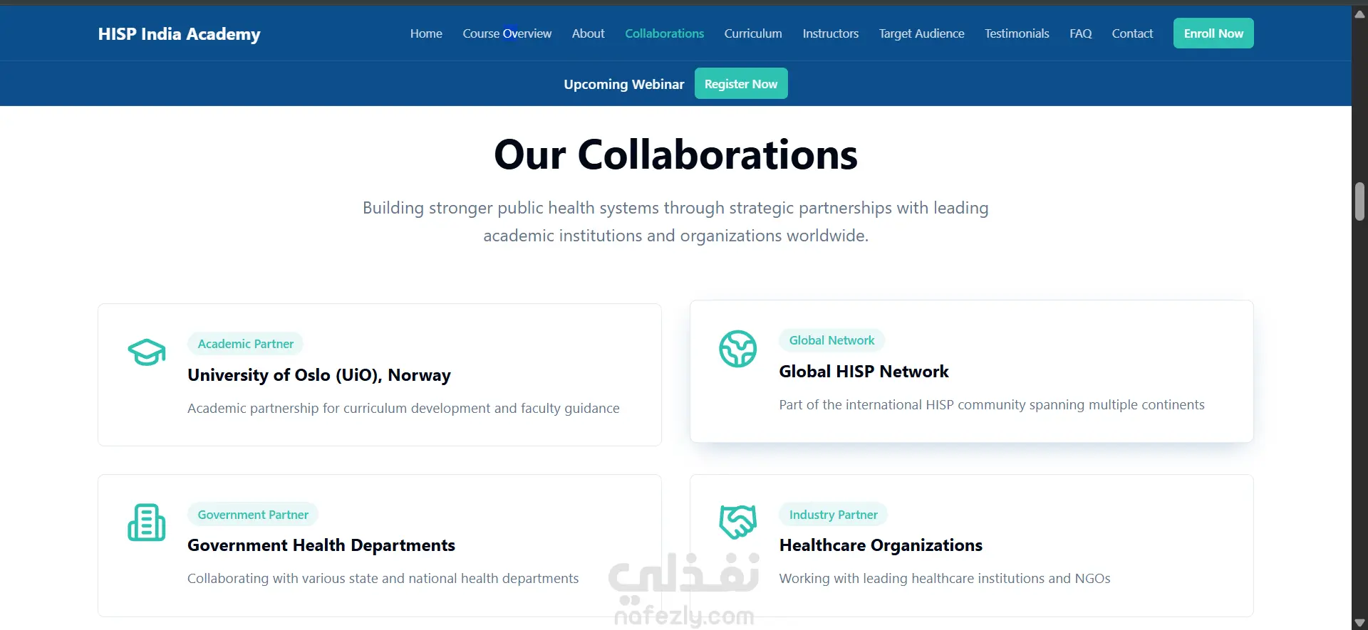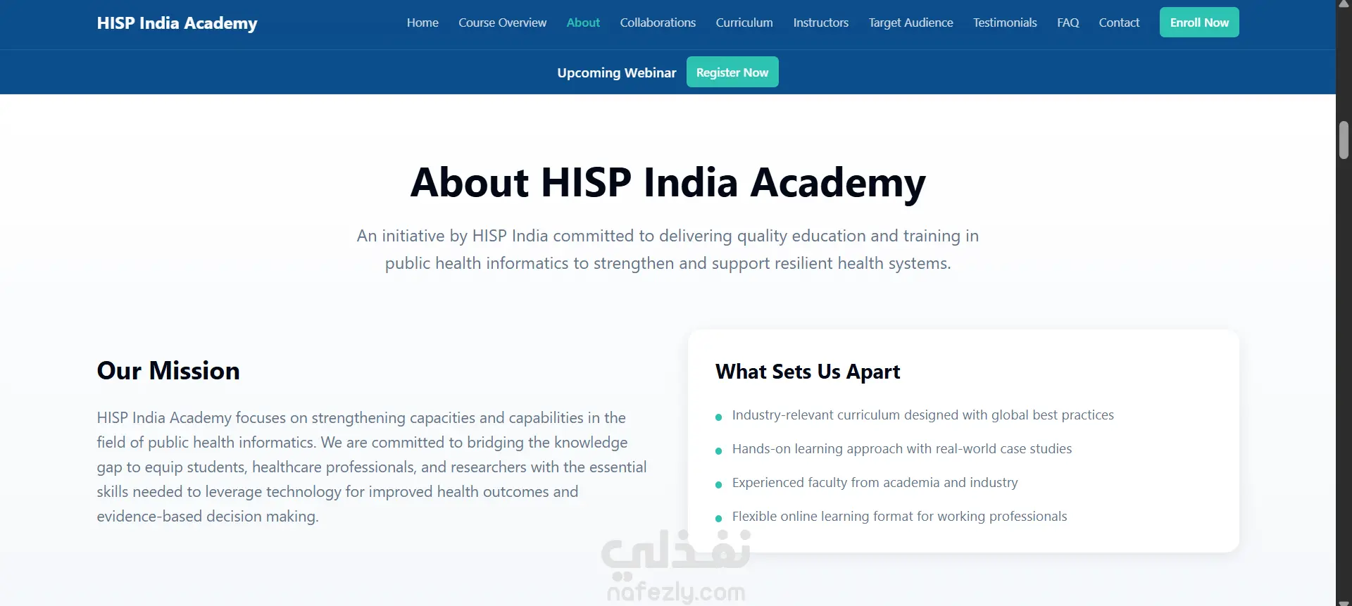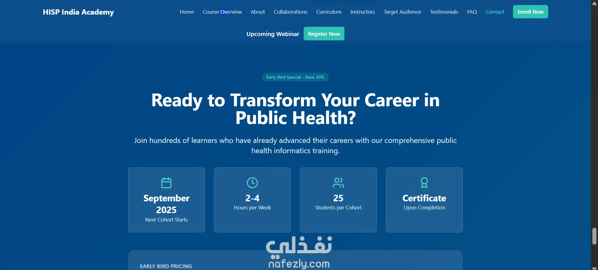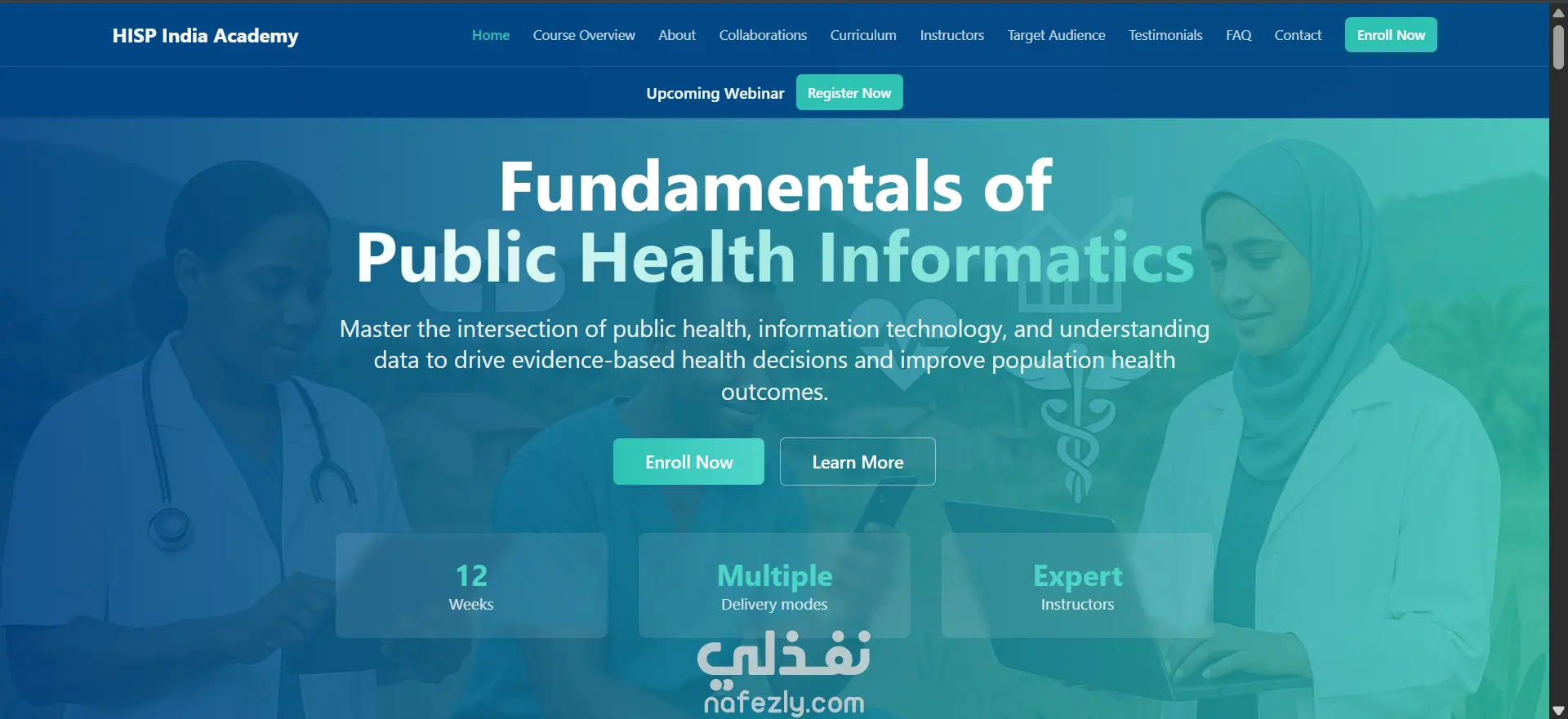 الموقع يعرض دورة تدريبية بعنوان “Fundamentals of Public Health Informatics”، ويتميز بتصميم عصري ومنظم يسهّل تجربة المستخدم ويعرض المحتوى بشكل جذاب.