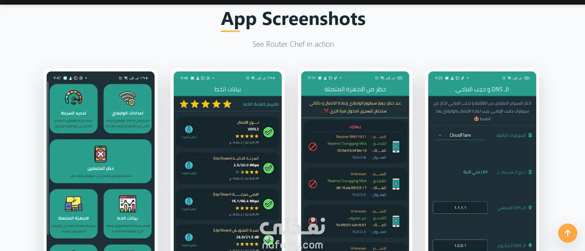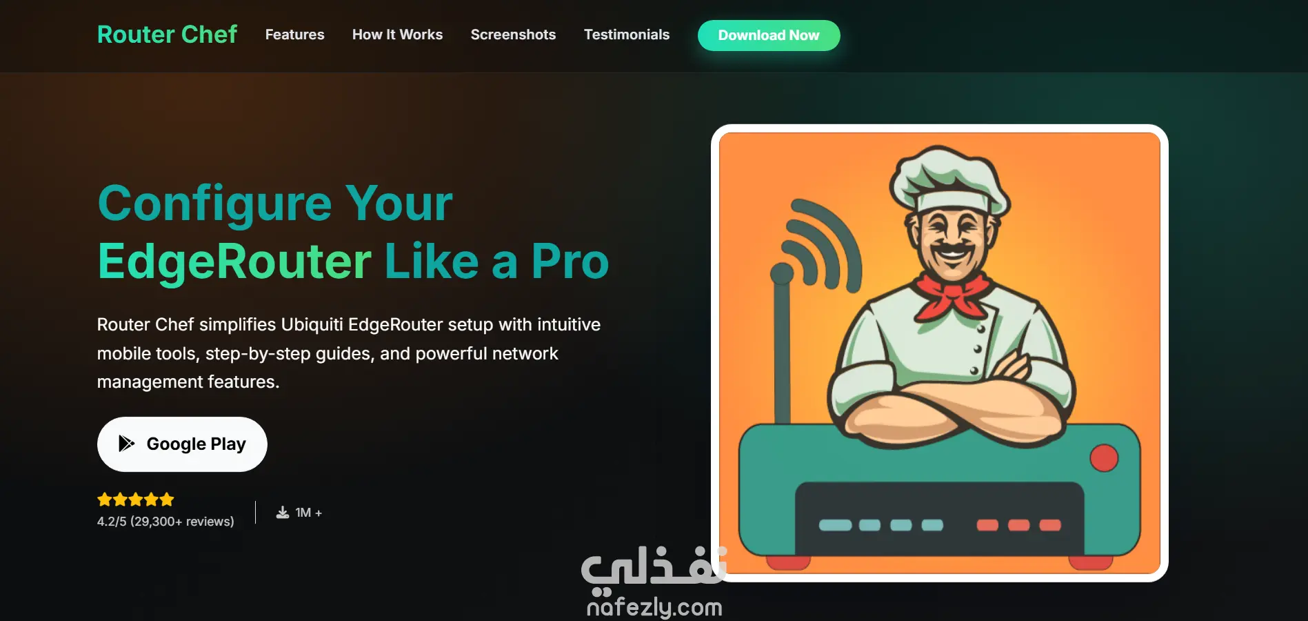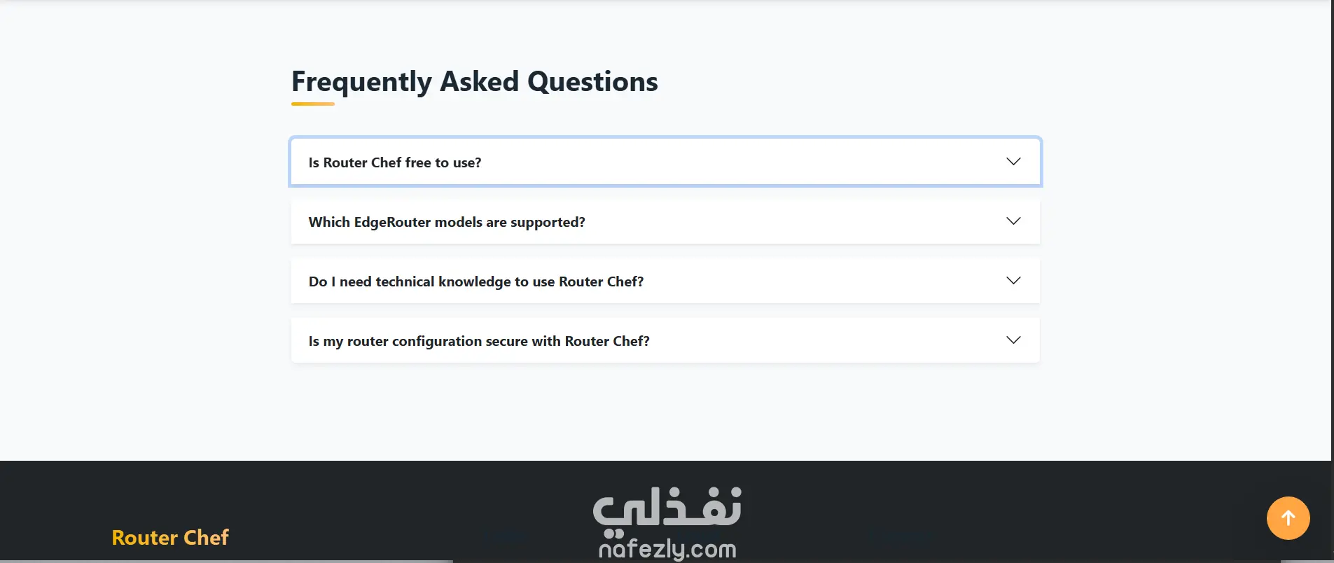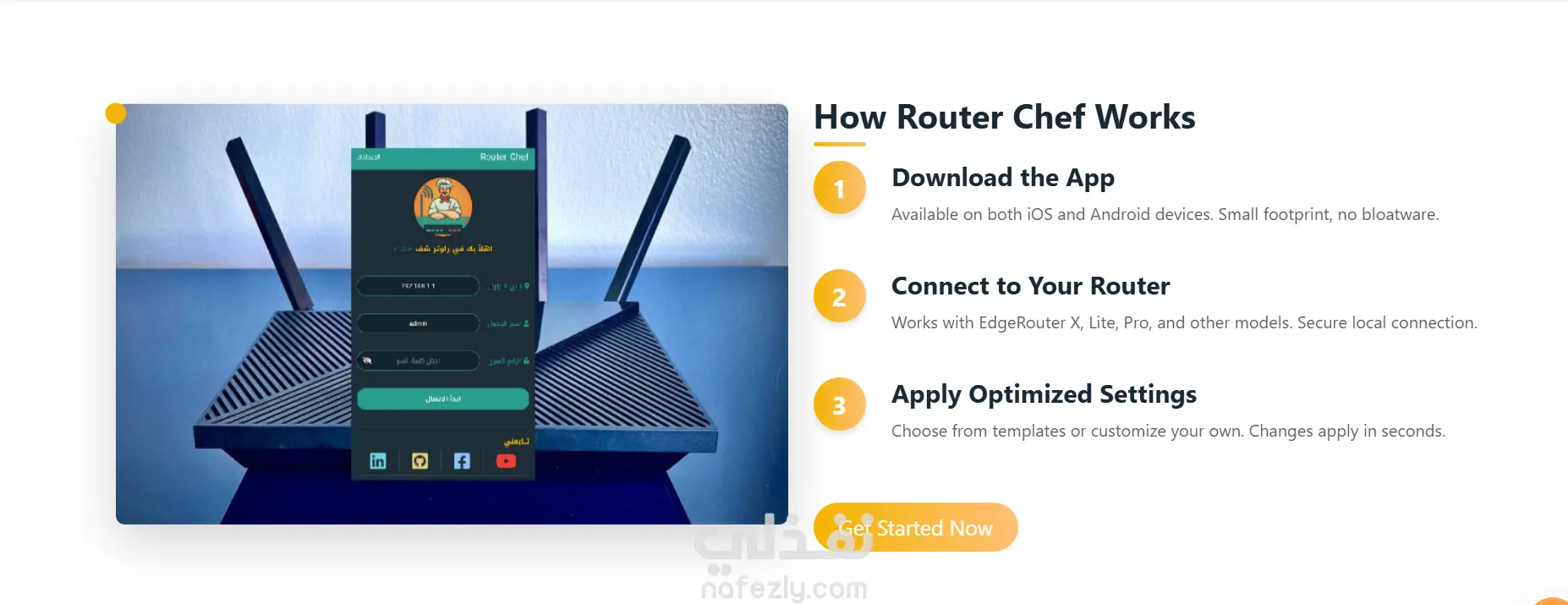 فحة هبوط مخصصة لتطبيق Router Chef الذي يبسط إدارة أجهزة الراوتر المنزلية. الصفحة سريعة التحميل، متجاوبة مع كل الأجهزة، ومصممة بشكل بسيط وواضح مع تحسين لمحركات البحث (SEO).