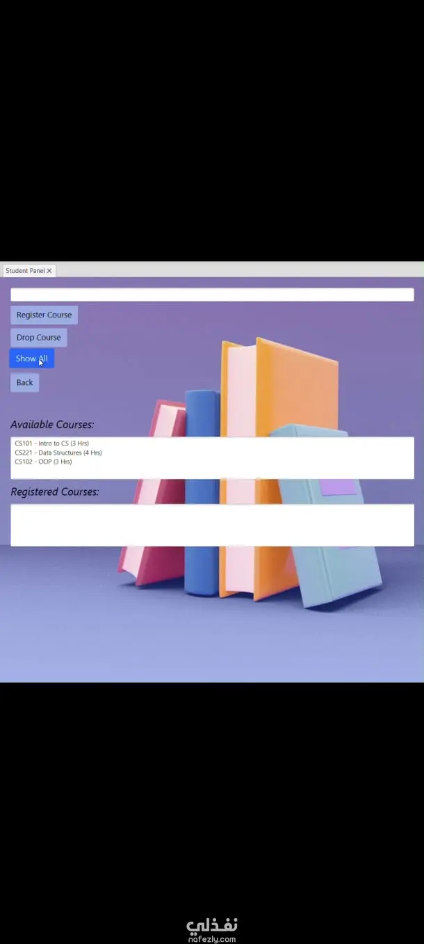مشروع Student Registration System هو تطبيق بلغة Java يهدف إلى إدارة عملية تسجيل الطلاب في المقررات الدراسية بطريقة منظمة وسهلة. يتيح للنظام إضافة الطلاب، تسجيلهم في المواد، تعديل البيانات، وحذفها، مع إمكانية عرض قائمة الطلاب المسجلين في كل مادة. تم تصميم المشروع باستخدام مبادئ البرمجة الكائنية التوجه (OOP) مثل الفئات (Classes)، الكائنات (Objects)، الوراثة (Inheritance)، والتغليف (Encapsulation). يمكن تشغيله كبرنامج Console Application أو من خلال واجهة رسومية بسيطة (GUI) باستخدام Swing أو JavaFX (بحسب الإصدار المستخدم).