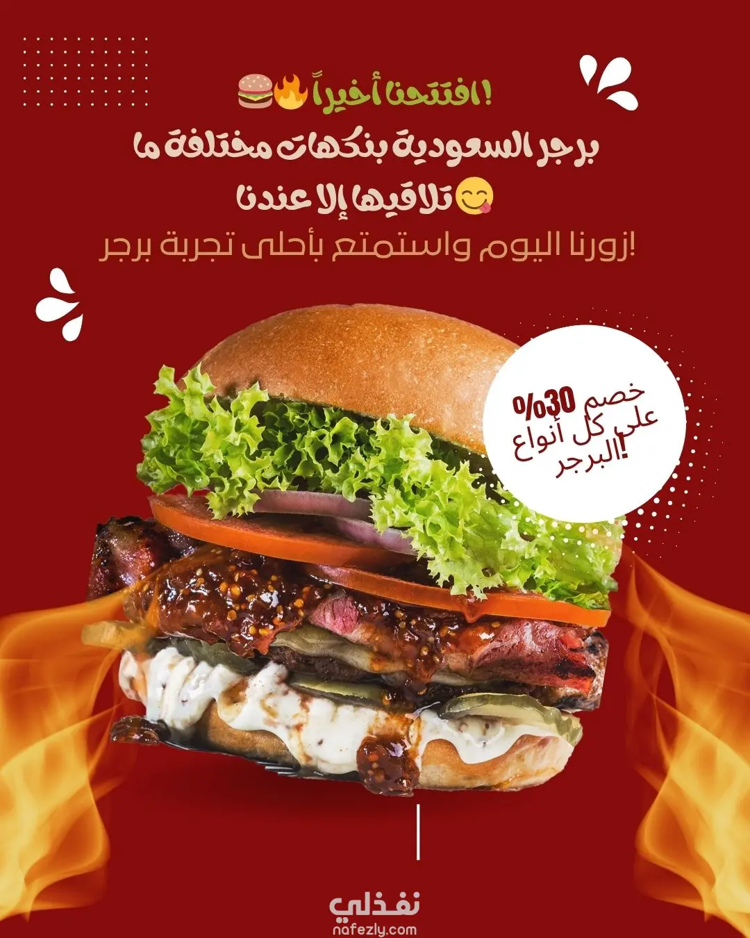 تم التركيز على إبراز المنتج (البرجر) بطريقة شهية وواضحة، مع استخدام عناصر بصرية مثل اللهب والخصم لجذب العملاء وتشجيعهم على التجربة.