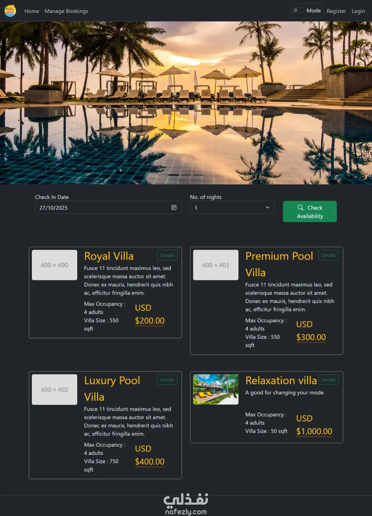 The app supports villa listings, amenities, booking flow with Stripe payments, and email notifications via SendGrid.