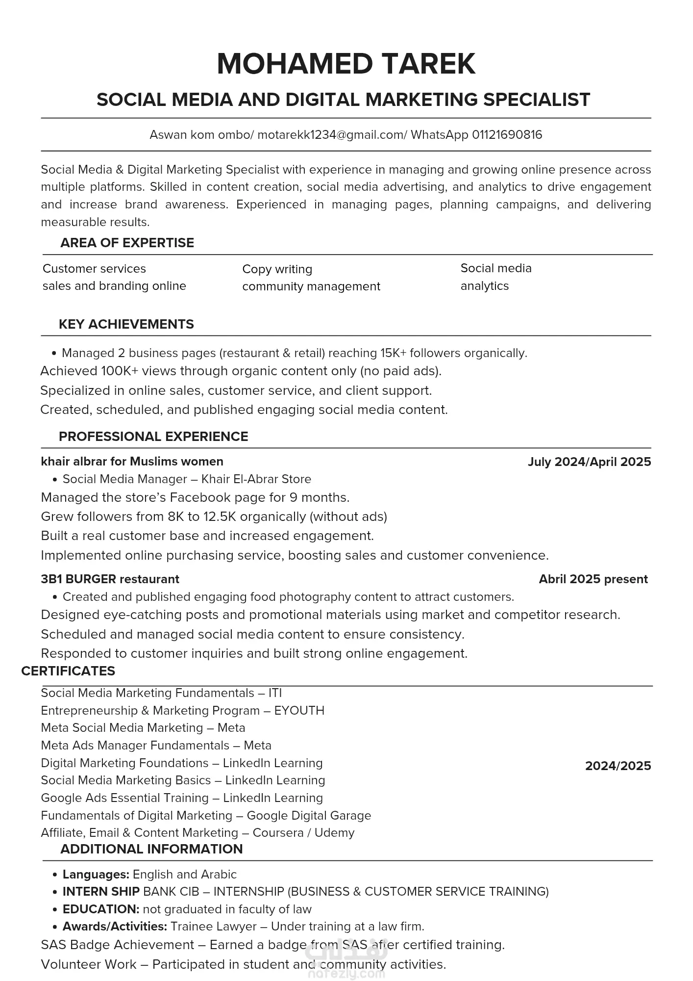 المطلوب انشاء cv ل social media specialist متوافق مع نظام ats