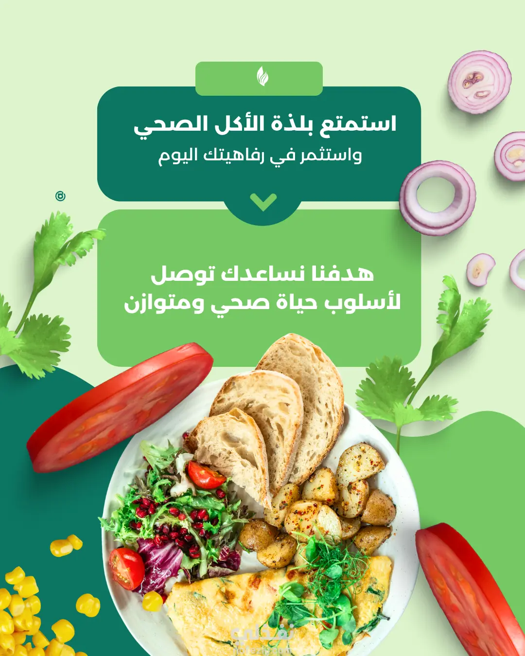 تصميم منشور إنستغرام باللون الأخضر يعبّر عن مفهوم التغذية الصحية وأسلوب الحياة المتوازن، بأسلوب بصري مبهج وبألوان مستوحاة من الطبيعة والنباتات. المنشور يهدف إلى تشجيع الجمهور على تناول طعام صحي والاستثمار في صحتهم اليومية. 🖋️ النص المستخدم: استمتع بلذة الأكل الصحي واستثمر في رفاهيتك اليوم @ هدفنا نساعدك توصل لأسلوب حياة صحي ومتوازن 🎨 تفاصيل التصميم: الأبعاد: 1080×1080 بكسل (منشور مربع لإنستغرام) الألوان: درجات الأخضر + الأبيض + لمسات صفراء دافئة الطابع العام: نظيف، بسيط، يوحي بالانتعاش والطبيعة 🛠️ الأدوات المستخدمة: Adobe Photoshop Adobe Illustrator خامات وأيقونات مفتوحة المصدر تراعي حقوق الاستخدام