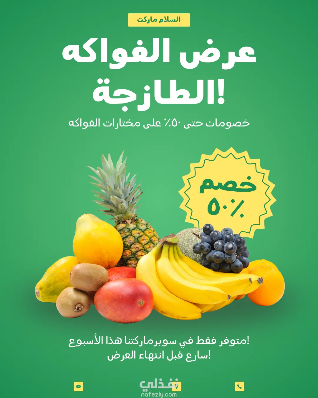 تصميم منشور ترويجي بسيط باللونين الأخضر والأصفر يعكس أجواء الانتعاش والطبيعة، مخصص لمنصة إنستغرام للترويج لعروض الفواكه في السلام ماركت. المنشور يهدف إلى جذب العملاء بالعروض والخصومات الموسمية. 🖋️ النص المستخدم: السلام ماركت خصم ٪٥٠ عرض الفواكه الطازجة! خصومات حتى ٥٠٪ على مختارات الفواكه متوفر فقط في سوبرماركتنا هذا الأسبوع! سارع قبل انتهاء العرض! 🎨 تفاصيل التصميم: الأبعاد: 1080×1080 بكسل (مربع مناسب لإنستغرام) الألوان: أخضر 🍏 + أصفر 🍋 لإبراز طابع الفواكه والانتعاش الأسلوب: بسيط، حيوي، واضح في عرض الخصم والعرض الترويجي 🛠️ الأدوات المستخدمة: Adobe Photoshop Adobe Illustrator خامات وأيقونات مفتوحة المصدر تراعي حقوق الاستخدام