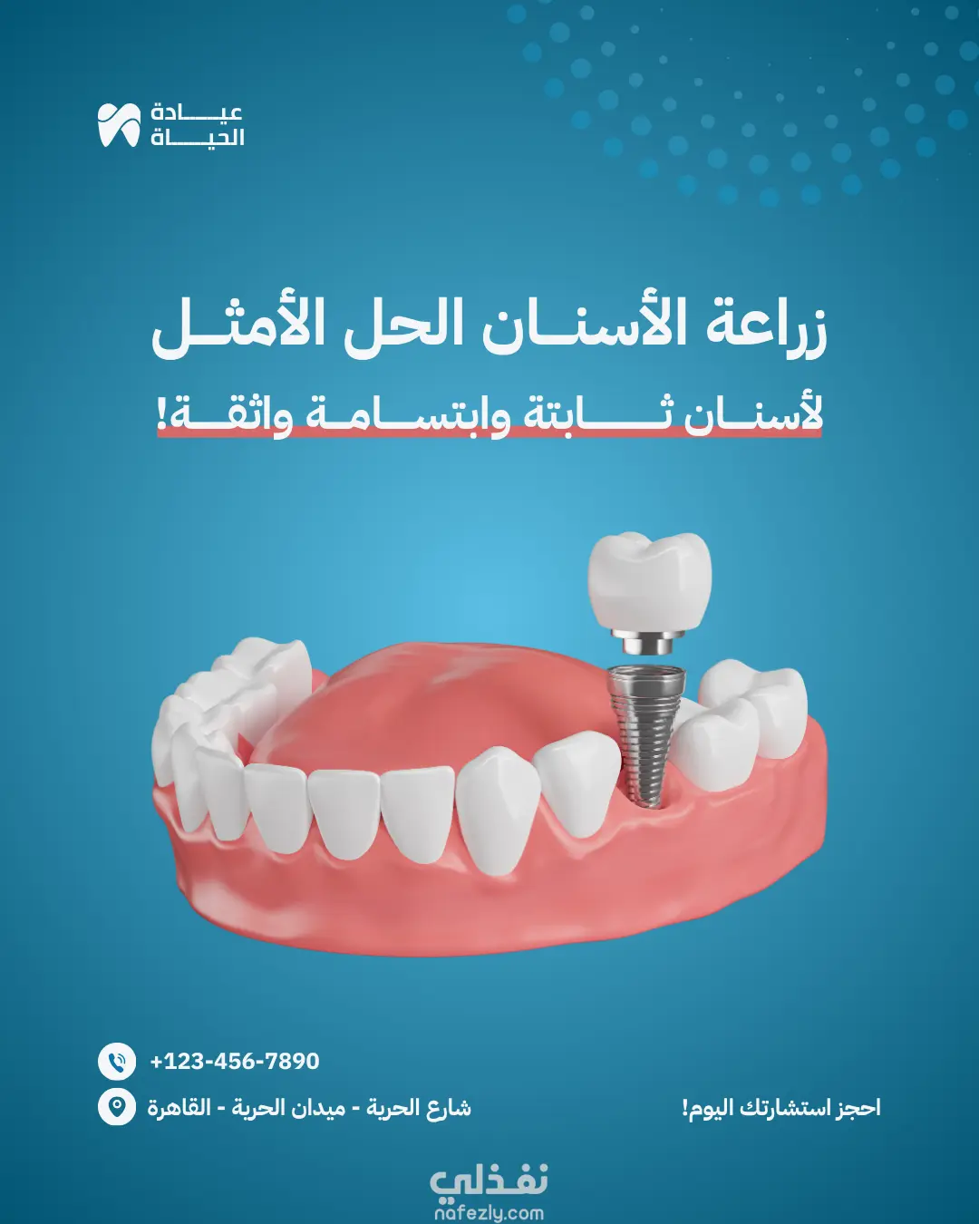 تصميم منشور دعائي حديث مخصص لمنصة إنستغرام للترويج لخدمات زراعة الأسنان في عيادة الحياة، بأسلوب عصري بألوان الأزرق والوردي يعكس الثقة والنظافة والجمال. 🖋️ النص المستخدم: لأسنـــــان ثــــــــابتة وابتســـــامــــة واثقـــــــة! زراعة الأسنــــان الحل الأمثــــل 📍 شارع الحرية - ميدان الحرية - القاهرة احجز استشارتك اليوم! 🦷 عيــــــادة الحيــــــاة 🎨 تفاصيل التصميم: الأبعاد: 1080×1080 بكسل (منشور إنستغرام) الألوان: أزرق فاتح + وردي باهت + أبيض النمط: حديث، نظيف، طبي احترافي العناصر: أيقونات طبية وأسنان بأسلوب مسطح (Flat Style) 🛠️ الأدوات المستخدمة: Adobe Photoshop Canva
