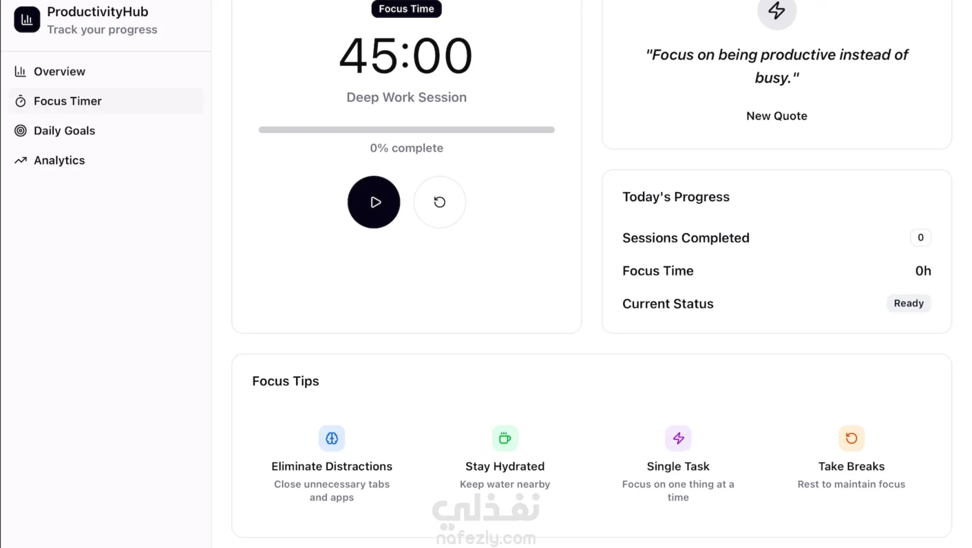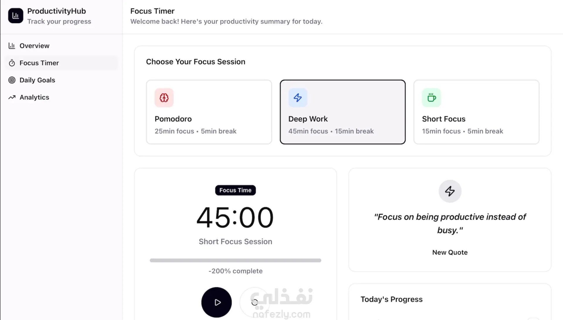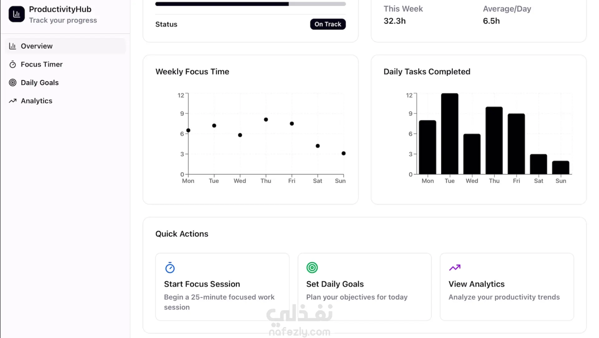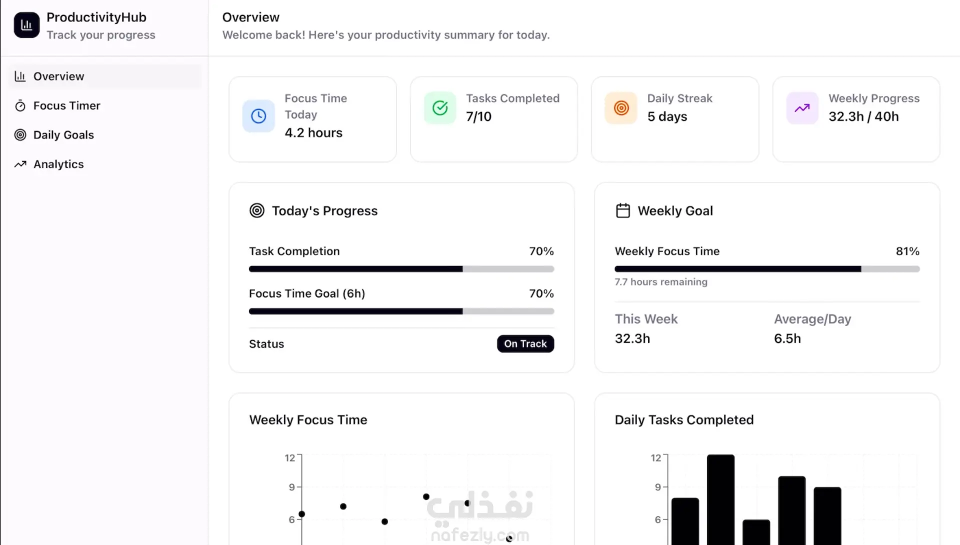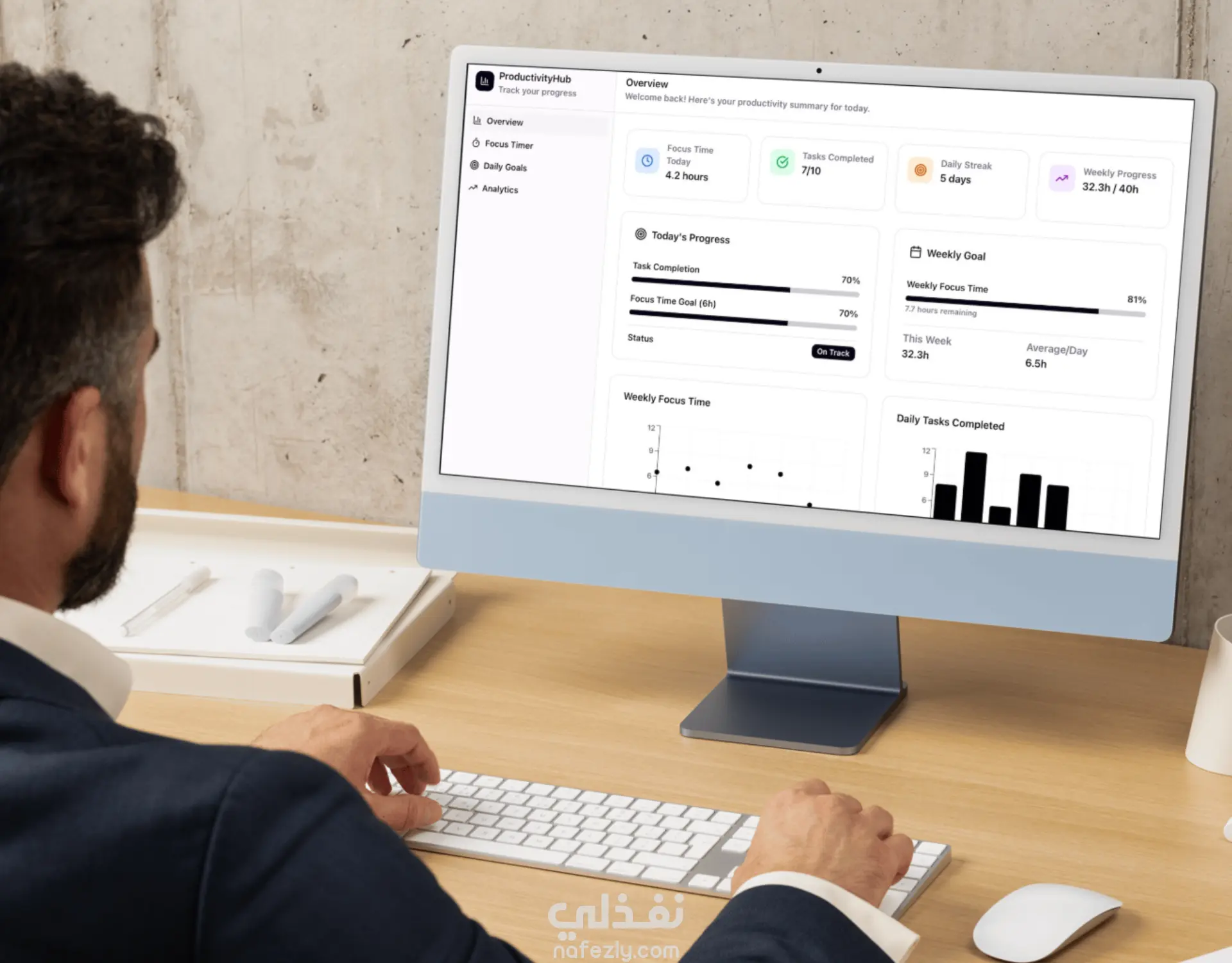 ProductivityHub منصة تساعدك على متابعة مهامك اليومية وتحقيق أهدافك وتنظيم وقتك من خلال عداد تركيز (Focus Timer)، وضع الأهداف اليومية، وتحليل مستوى إنتاجيتك. تُمكنك المنصة من تتبع الإنجازات، مراقبة ساعات العمل الفعلي، واستعراض اتجاهات الأداء الأسبوعية والشهرية لتحسين النتائج والوصول لأعلى إنتاجية