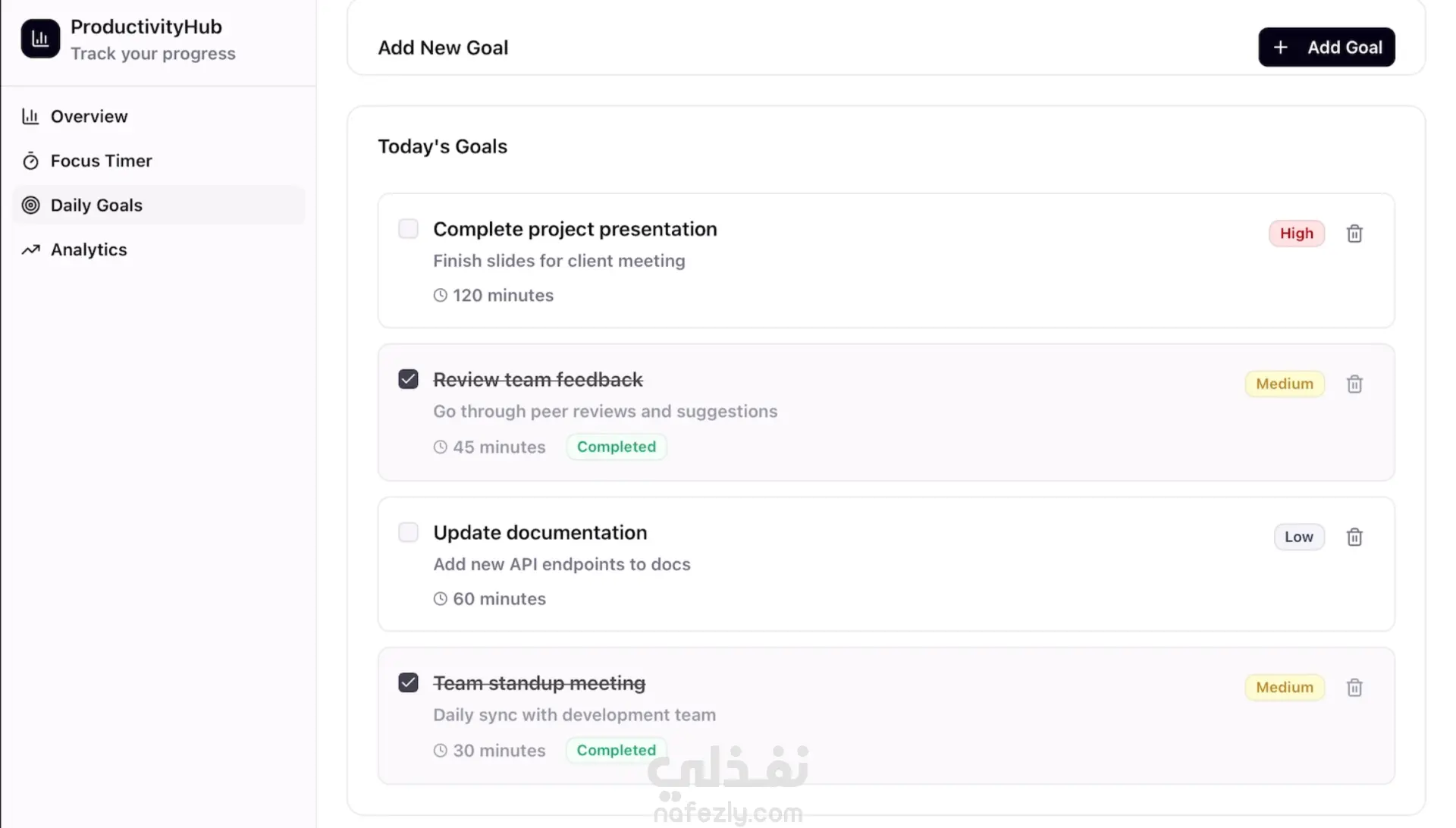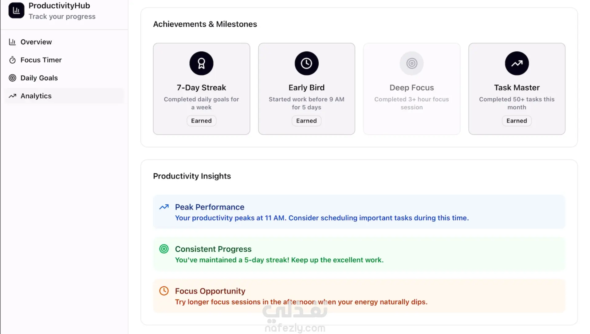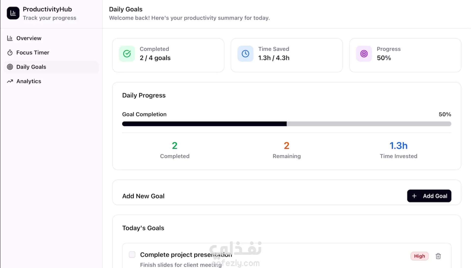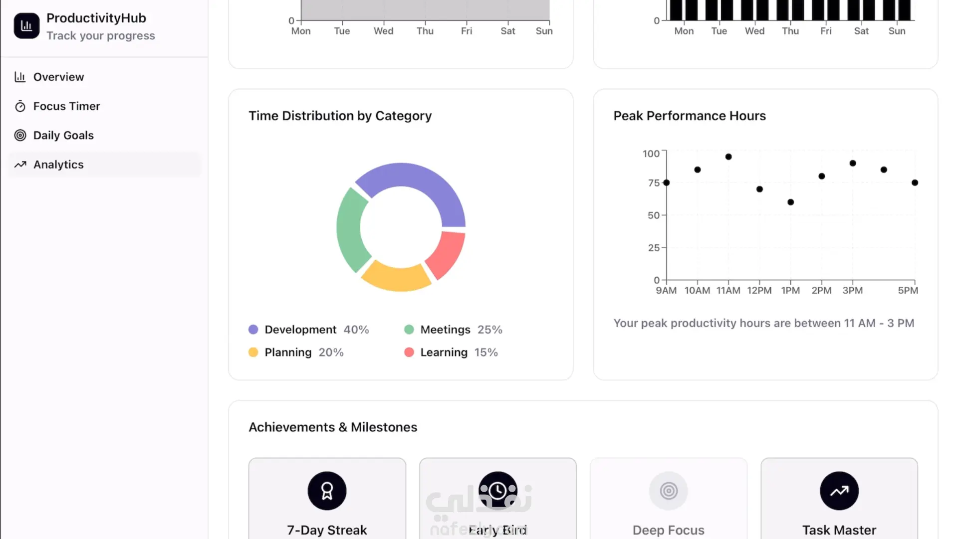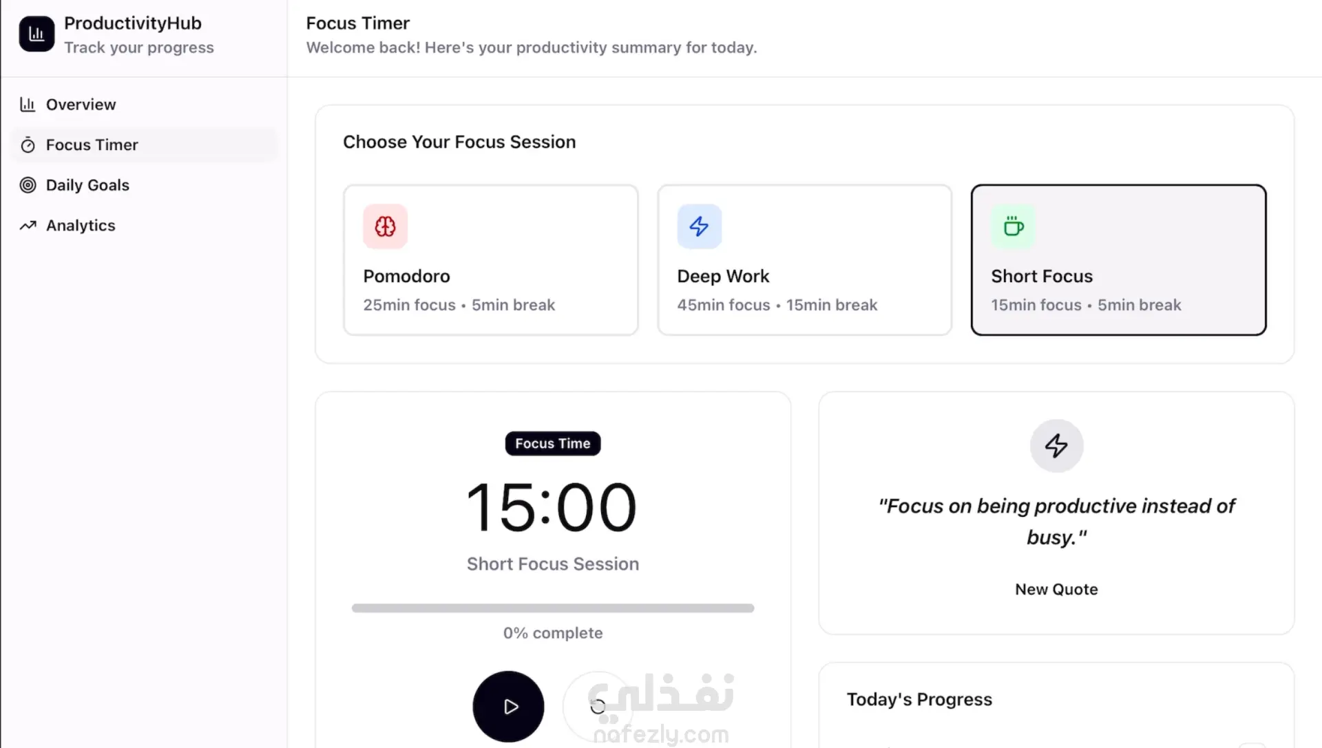 ProductivityHub منصة تساعدك على متابعة مهامك اليومية وتحقيق أهدافك وتنظيم وقتك من خلال عداد تركيز (Focus Timer)، وضع الأهداف اليومية، وتحليل مستوى إنتاجيتك. تُمكنك المنصة من تتبع الإنجازات، مراقبة ساعات العمل الفعلي، واستعراض اتجاهات الأداء الأسبوعية والشهرية لتحسين النتائج والوصول لأعلى إنتاجية