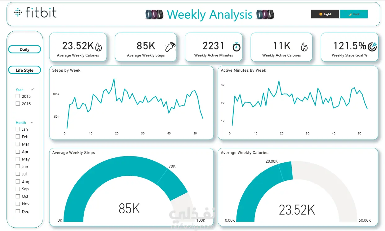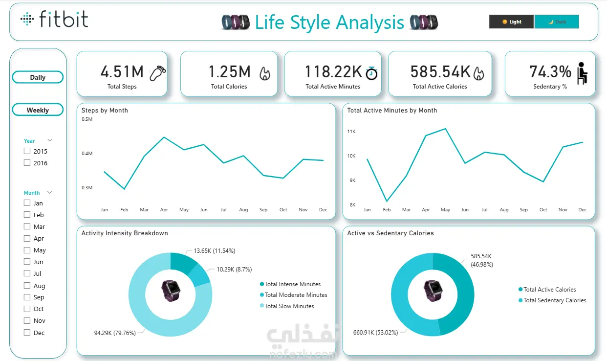 نظرة عامة على المشروع: تم تطوير لوحة تحكم تفاعلية باستخدام Power BI لتحليل وتصوير بيانات اللياقة البدنية ونمط الحياة، مما يساعد المستخدمين والمؤسسات على تتبع مؤشرات الصحة واتجاهات النشاط بشكل فعّال. العناصر الرئيسية: دمج البيانات: تم جمع وربط البيانات من مصادر متعددة تشمل نشاط المستخدم، التغذية، وأداء التمارين الرياضية. نمذجة البيانات: إنشاء نموذج بيانات منظم داخل Power BI لضمان علاقات دقيقة وديناميكية بين الجداول. معادلات DAX: تطوير مؤشرات رئيسية مثل: إجمالي عدد التمارين متوسط السعرات المحروقة معدل تكرار التمارين نسبة تحقيق الأهداف المرئيات التفاعلية: تصميم رسوم بيانية تفاعلية توضح اتجاهات النشاط البدني، مقارنة السعرات المتناولة والمحروقة، وتتبع التقدم نحو الأهداف. الفلاتر والمحددات (Slicers): إضافة فلاتر ديناميكية حسب الجنس، الفئة العمرية، نوع النشاط، والفترة الزمنية. النتيجة: توفر لوحة التحكم رؤية واضحة قائمة على البيانات لأداء المستخدمين وعاداتهم الصحية، مما يمكّن من تحسين التخطيط، تتبع التحفيز، وتحليل التقدم.