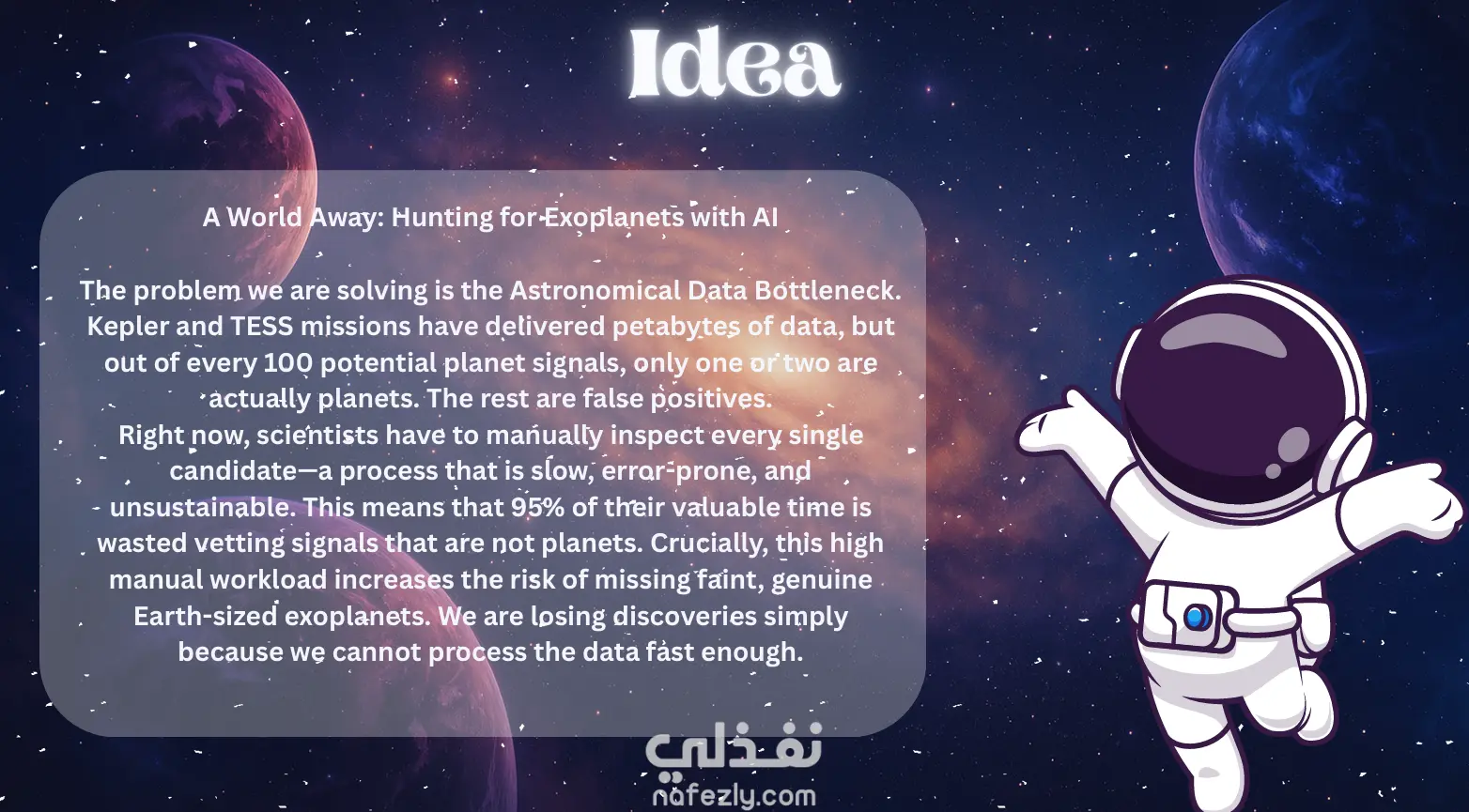هذا العمل كنت مشاركة به انا وبعض الأصدقاء حيث قمت بتصميم هذا ال presentation لعرض الفكرة الخاصة بنا. الفكرة كانت عبارة عن بناء موديل بالذكاء الأصطناعي يمكنه تحديد ما اذا كان الشعاع لكوكب حقيقي ام مجرد مجسم في الفضاء. لقد قمت بإضافة لينك ال presentation على كانفا في حالة ما ترغب برؤية المزيد. في حالة ما كنت تريد الذهاب الى اللينك اتمنى منك عمل عرض او present لتتمكن من رؤية التصميم بال animation.