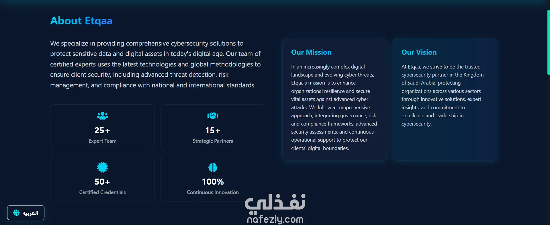 Etqaa – الموقع الرسمي لشركة اتقاء للأمن السيبراني / قيد التنفيذ موقع إلكتروني احترافي مصمم خصيصًا لشركة اتقاء المتخصصة في خدمات الأمن السيبراني، بهدف عرض خدمات الشركة بشكل واضح وجذاب، وبناء الثقة مع العملاء من خلال تصميم عصري وتجربة مستخدم متميزة. تم تطوير الموقع باستخدام React وFramer Motion لتقديم تجربة تفاعلية سلسة ومحترفة. كما يدعم الموقع اللغتين العربية والإنجليزية لتوسيع الوصول إلى جمهور محلي ودولي، مع تصميم متجاوب يعمل بكفاءة عالية على مختلف الأجهزة. يتضمن الموقع أقسامًا متنوعة مثل: نبذة عن الشركة، الخدمات، قيم الشركة، نقاط القوة، ومعلومات التواصل، مع مراعاة إبراز الهوية الرقمية للشركة بشكل يعكس قوتها التقنية ومصداقيتها في مجال الأمن السيبراني. الموقع مصمم لتعزيز الحضور الرقمي لشركة اتقاء، وعرض خدماتها بفعالية لجذب العملاء المهتمين بالحماية السيبرانية وحلول الأمان الرقمي.