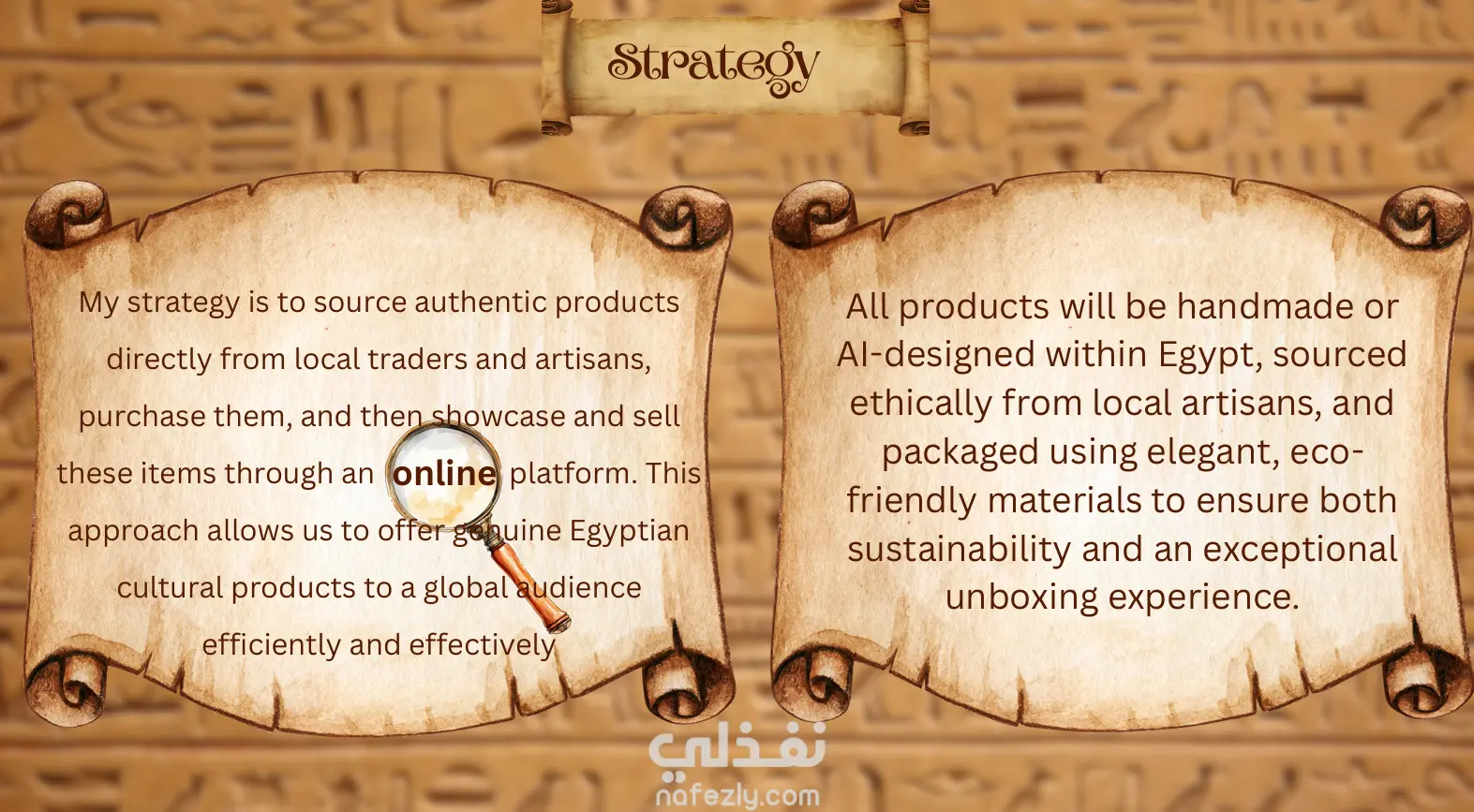 لقد قمت بتصميم هذا العرض اثناء عرضنا لهذه الفكرة على بعض الشركات بهدف الجذب السياحي المصري و ايضًا زيادة الصادرات. هذه الفكرة عبارة عن موقع الكتروني لعرض التحف الفنية والزخارف المصرية الخاصة بالحضارة الفرعونية. تستهدف الفكرة السياح داخل وخارج مصر الذين يريدون بعض المتعلقات الخاصة بالحضارة المصرية.