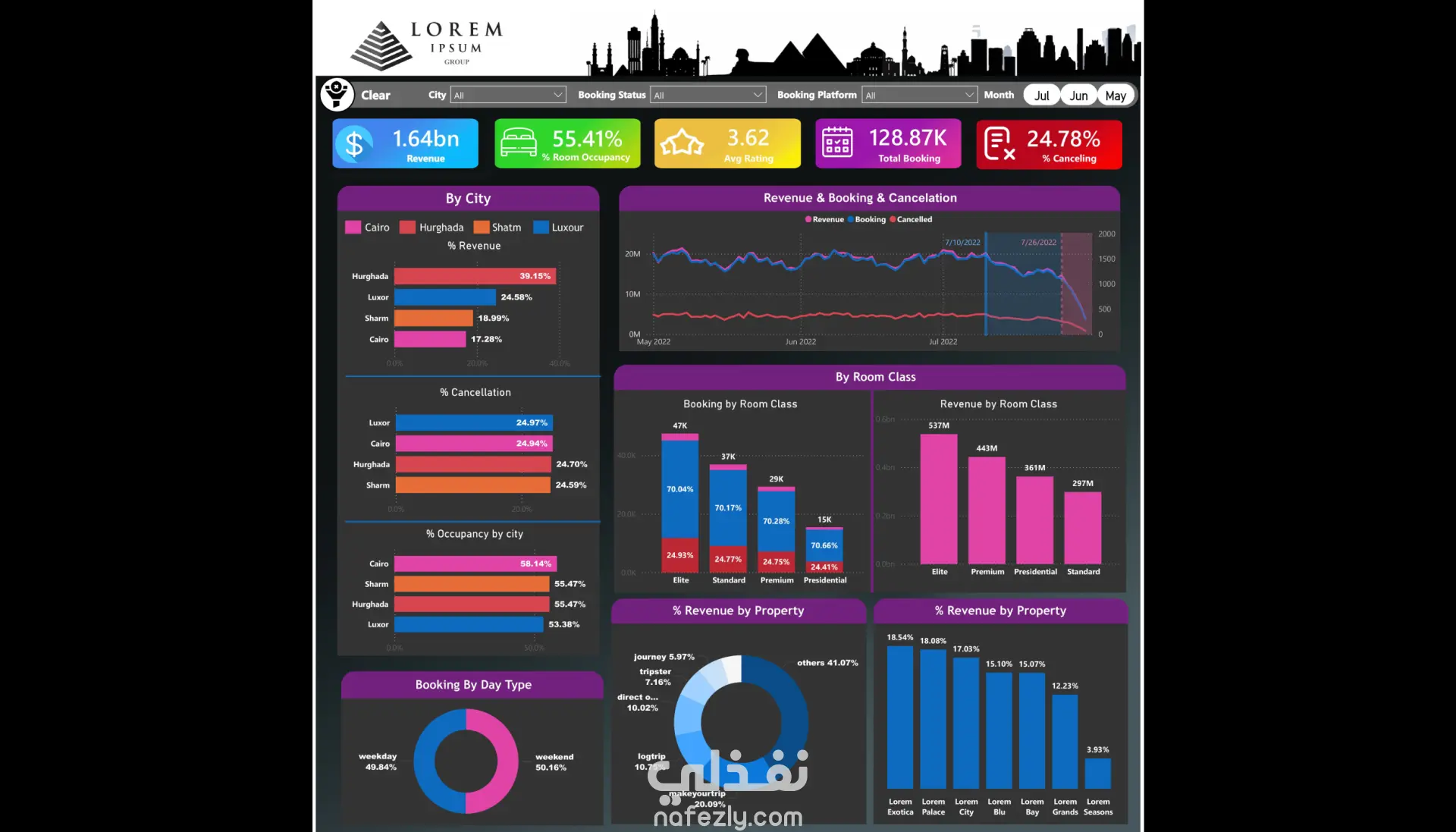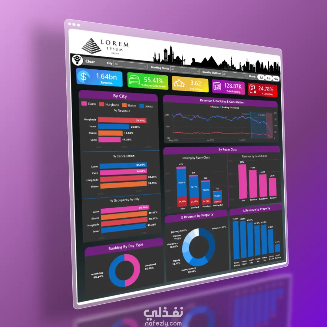 لوحة تفاعلية توضح مؤشرات الأداء الرئيسية (KPIs) للفنادق.