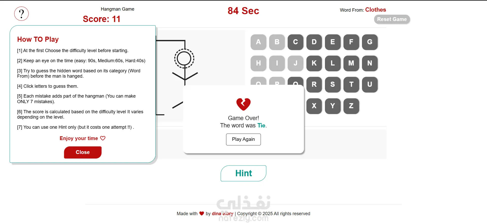 صممت مشروع لعبة Hangman كامل لتحدي مهارات التخمين قبل انتهاء الوقت.