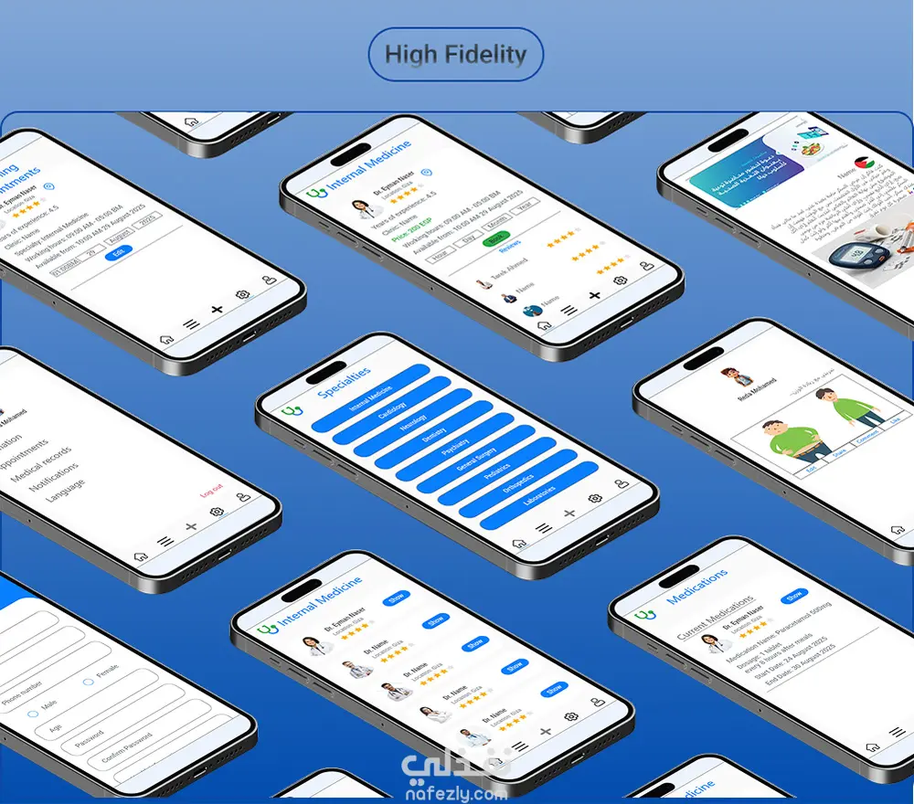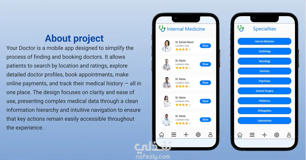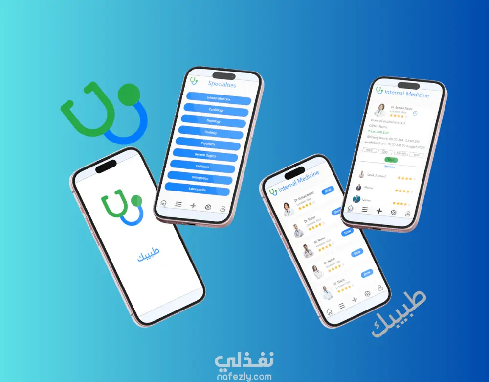 تطبيق موبايل يتيح للمستخدمين البحث عن الأطباء حسب الموقع والتقييمات، عرض الملفات الشخصية بالتفصيل، حجز المواعيد، الدفع أونلاين، وتتبع السجل الطبي بسهولة.