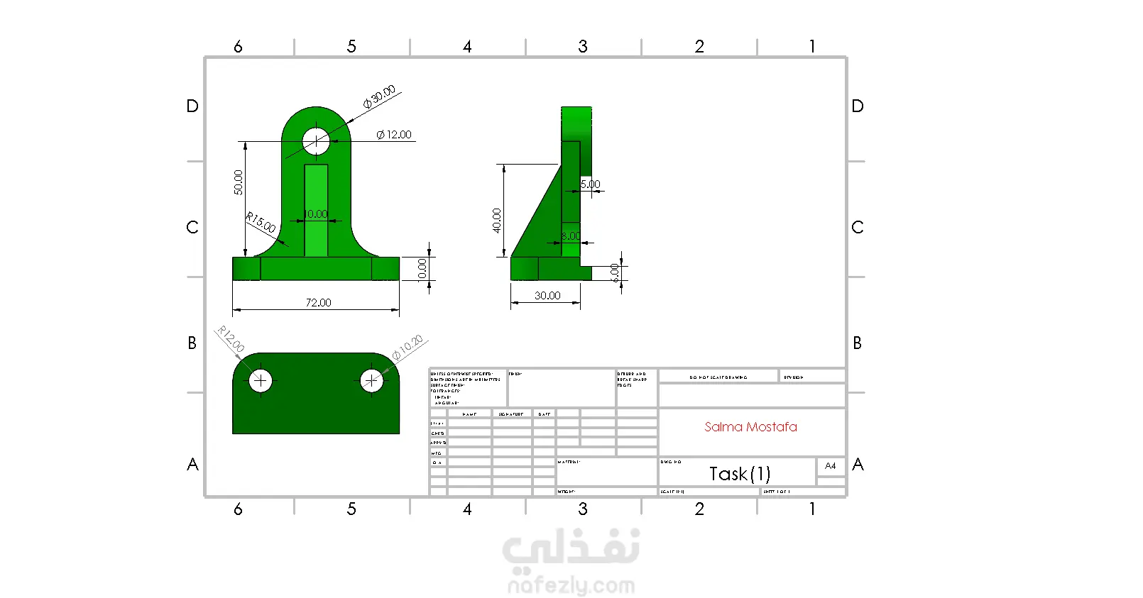يمثل هذا المشروع مهارة أساسية في التصميم الهندسي، وهي تحويل النماذج ثلاثية الأبعاد (3D Models) إلى رسومات هندسية تنفيذية (Shop Drawings) ثنائية الأبعاد، جاهزة لورش التصنيع. ما تم إنجازه: قمت بإنشاء مخطط هندسي (Technical Drawing) كامل لقطعة ميكانيكية باستخدام برنامج SolidWorks (أو البرنامج الذي استخدمتِه). يتضمن الرسم ما يلي: * المساقط الهندسية (Orthographic Views): تم توضيح جميع المساقط المطلوبة لفهم التصميم (الأمامي، الجانبي، والعلوي). * الأبعاد الدقيقة (Dimensioning): تم وضع جميع الأبعاد والمواصفات (مثل الأقطار، الأطوال، وأنصاف الأقطار) اللازمة للتصنيع بدقة، كما هو موضح في المخطط. * لوحة العنوان (Title Block): تم إعداد الرسم في لوحة رسم قياسية (A4) تحتوي على بيانات المشروع. ما يثبته هذا المشروع: القدرة على إنشاء رسومات تنفيذية احترافية ومتوافقة مع معايير الصناعة. الدقة الفائقة في وضع الأبعاد (Dimensioning) والتفاوتات (Tolerances). الكفاءة في استخدام برامج CAD لإنتاج مخرجات هندسية جاهزة للتصنيع.