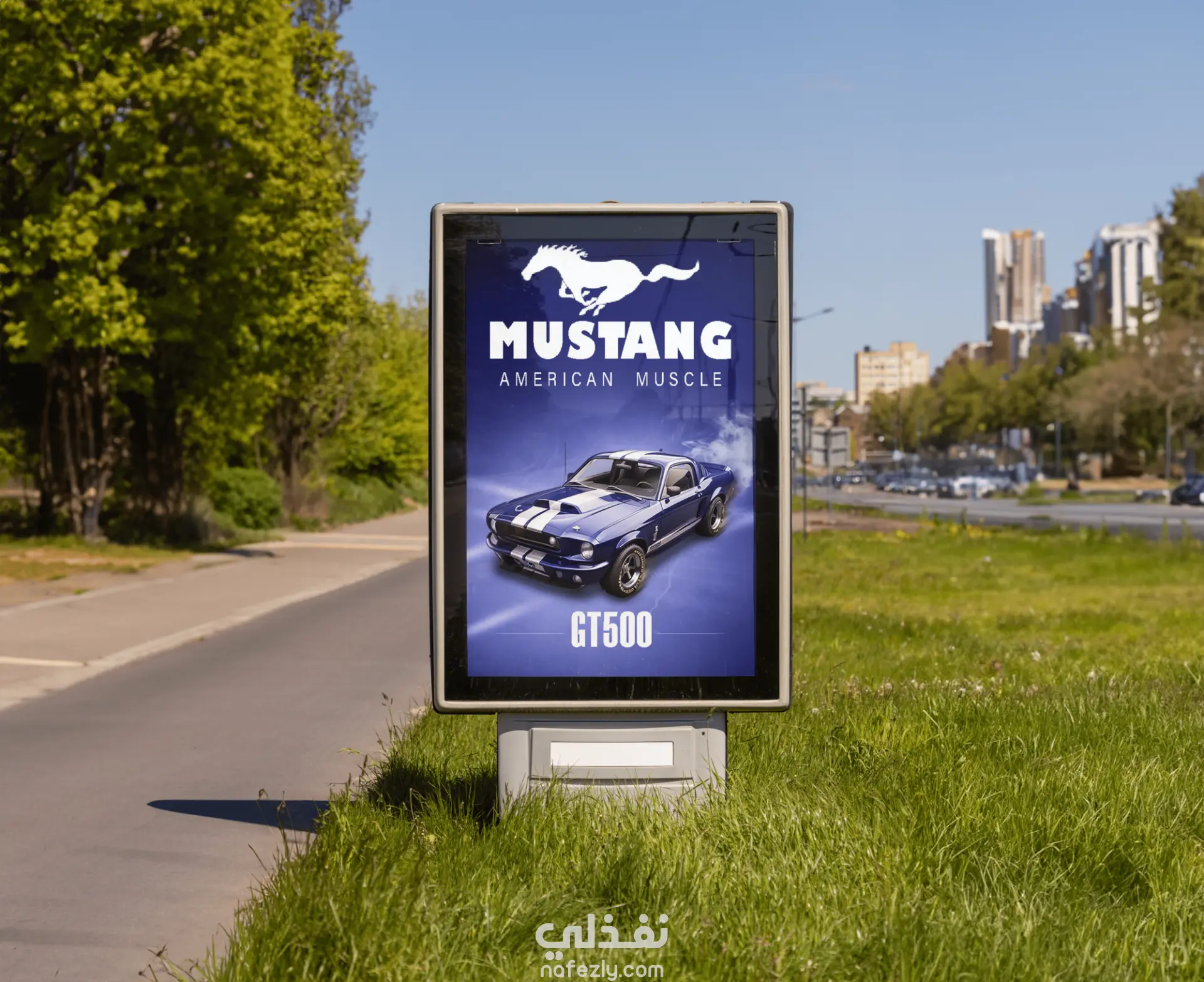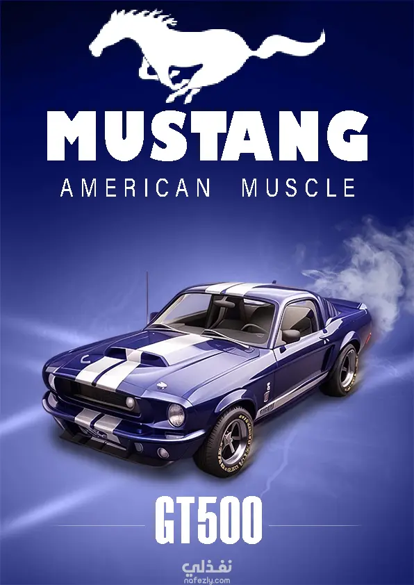 نوع التصميم: إعلان مطبوع/رقمي لسيارة الأسلوب: عضلات أمريكية (American Muscle) الألوان: أزرق وأبيض بتناسق قوي الهدف: جذب عشاق السيارات الرياضية وتعزيز صورة العلامة التجارية