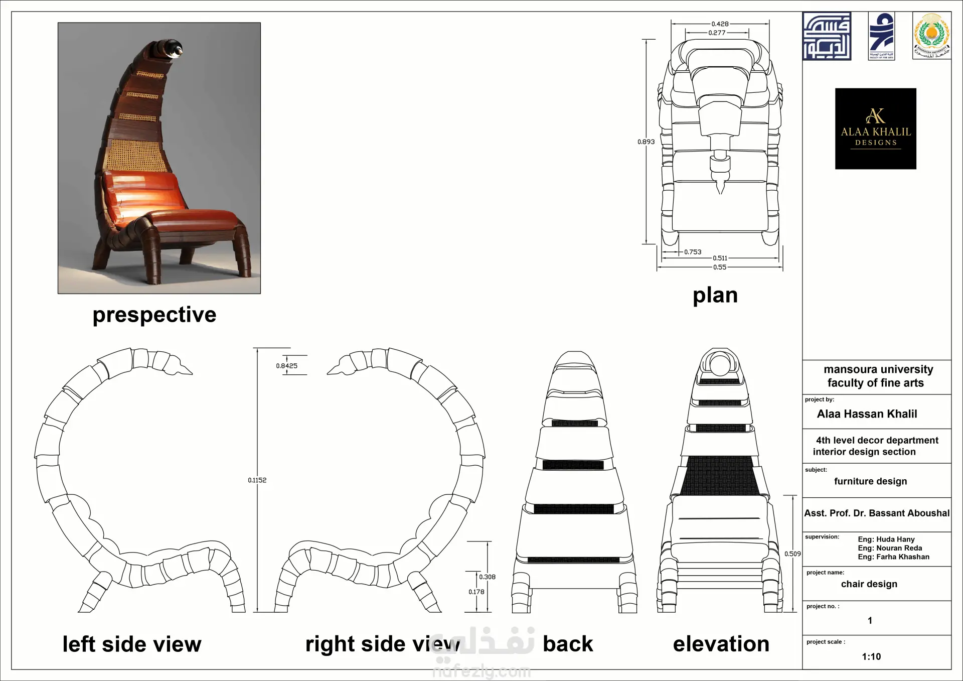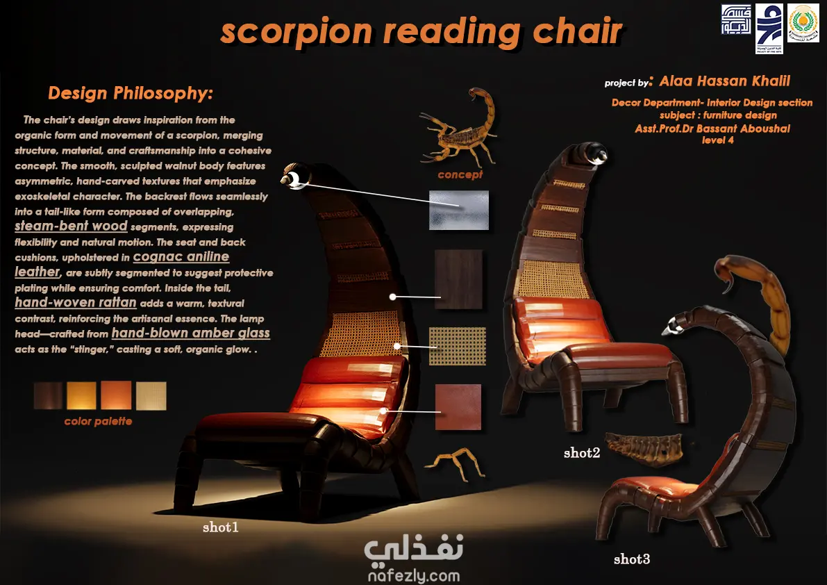 يستوحي تصميم الكرسي فكرته من الشكل والحركة العضوية للعقرب، حيث يدمج بين الهيكل والخامة والحِرَفية في مفهوم متكامل. يتميز الجسم الخشبي المصنوع من الجوز المنحوت والمصقول بأسطح غير متناظرة تُبرز الطابع اليدوي والمظهر الهيكلي الخارجي. يمتد مسند الظهر بانسيابية ليشكل الذيل المصمم من شرائح خشبية منحنية بالبخار ومتداخلة، معبّرًا عن المرونة والحركة الطبيعية. أما المقعد ومسند الظهر المغلفان بجلد الأنيلين بلون الكونياك، فيتّسمان بتقسيمات بسيطة توحي بدرعٍ واقٍ مع الحفاظ على الراحة. ويضيف الخيزران المنسوج يدويًا داخل الذيل تباينًا دافئًا وملمسيًا يعزز الطابع الحرفي. يعمل رأس المصباح المصنوع من الزجاج الكهرماني المنفوخ يدويًا كـ«إبرة» تضفي ضوءًا عضويًا ناعمًا. وتكمل اللمسات المعدنية من البرونز المعتّق التصميم بأناقة ترابية. في المجمل، يحتفي الكرسي بالفن الطبيعي والحرفة والتوازن بين القوة والأناقة المستوحاة من الأشكال العضوية. مراحل إعداد التصميم والعرض التقديمي: Autocad: إعداد المخططات الثنائية الأبعاد (2D) لرسم الأبعاد الدقيقة للكرسي وتحديد نسب التكوين العامة. 3ds Max + Corona Renderer: تحويل المخطط إلى نموذج ثلاثي الأبعاد، تصميم الكتلة، وتطبيق الخامات الطبيعية مثل الخشب والجلد والزجاج مع إعدادات إضاءة واقعية لإظهار الخامات بدقة. Photoshop: تحسين الريندر النهائي، ضبط الألوان، الإضاءة، وإضافة الخلفية والعناصر الجمالية لتقديم عرض بصري احترافي وجذاب.