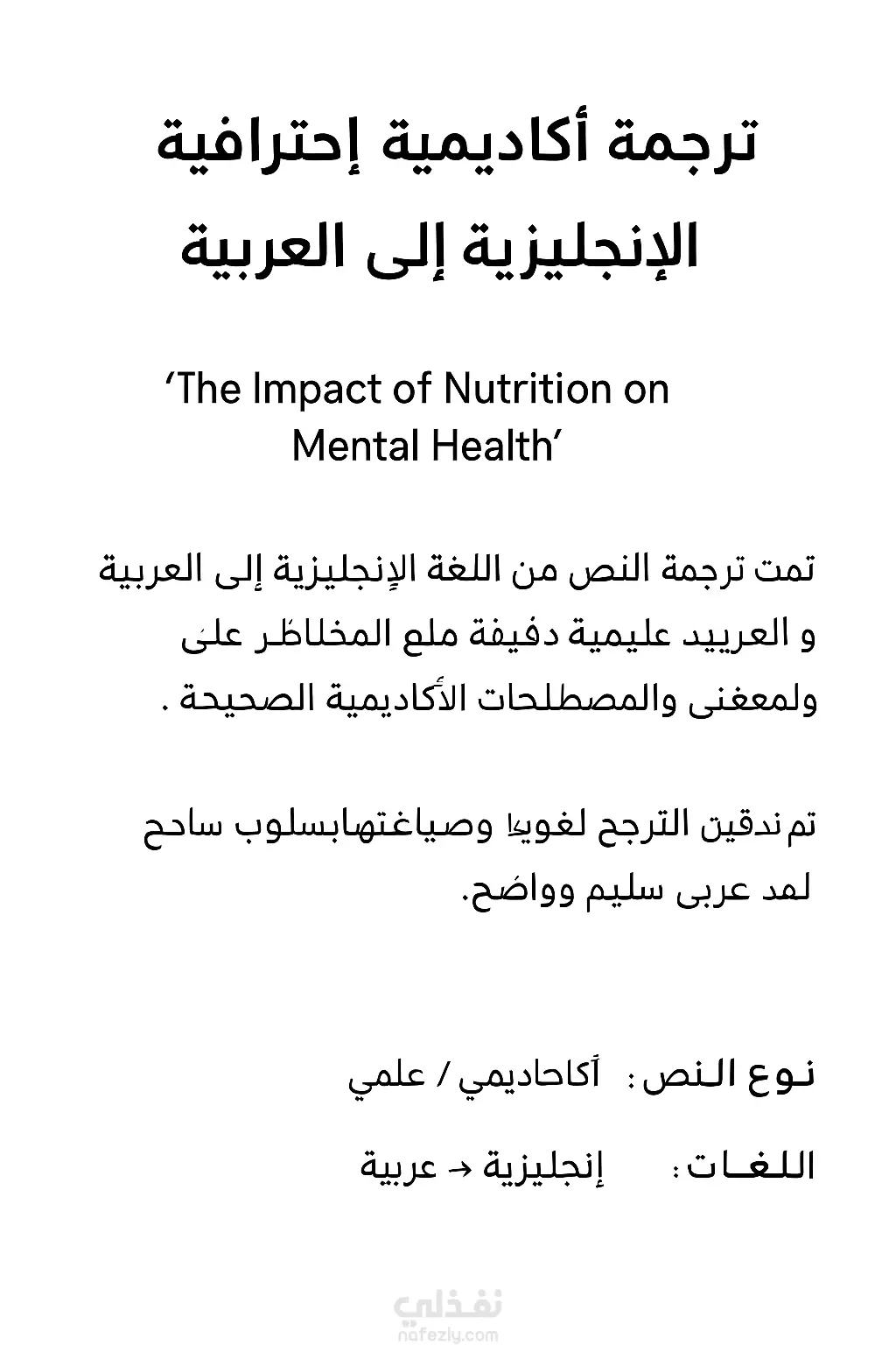 ترجمة أكاديمية لمقال بعنوان "The Impact of Nutrition on Mental Health". تمت ترجمة النص من اللغة الإنجليزية إلى العربية بلغة علمية دقيقة، مع الحفاظ على المعنى والمصطلحات الأكاديمية الصحيحة. تم تدقيق الترجمة لغويًا وصياغتها بأسلوب عربي سليم وواضح. نوع النص: أكاديمي / علمي اللغات: إنجليزية → عربية