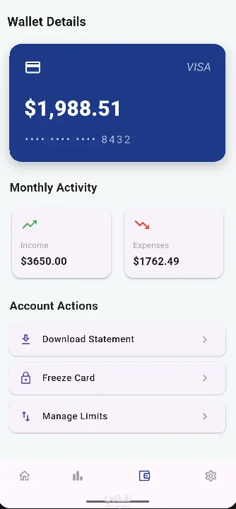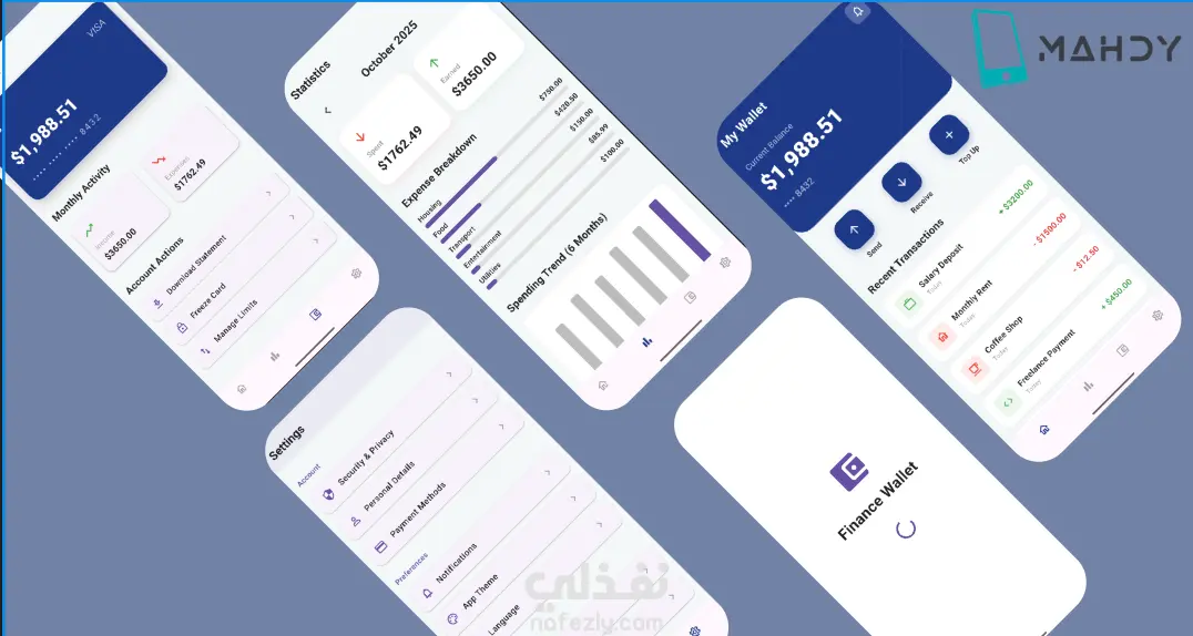 يجمع التطبيق بين قوة الأداء وسلاسة التصميم. من اللحظة التي يظهر فيها شعار التطبيق المتحرك (Animated Splash Screen) أثناء التحميل، وحتى تصفحك بين شاشاته المختلفة، ستشعر بالانتقال السلس والتركيز التام على بياناتك المالية.