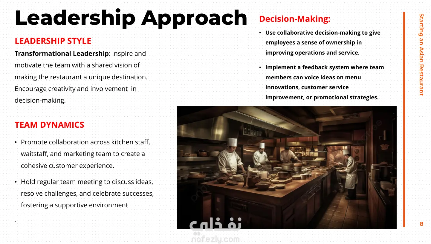 قمت بتصميم عرض تقديمي احترافي لمشروع مطعم صيني بعنوان “Starting an Asian Restaurant”، يوضح خطة عمل متكاملة لإطلاق مطعم متخصص في المأكولات الآسيوية في كفر الشيخ. العرض يدمج بين الجانب الإداري والتسويقي والمالي بأسلوب منظم وسهل القراءة، مع تصميم أنيق يجمع بين الألوان الهادئة والعصرية لجذب الانتباه. محتوى العرض: تحليل SWOT شامل (نقاط القوة، الضعف، الفرص، والتهديدات). الرؤية والرسالة والأهداف قصيرة وطويلة المدى. تحليل السوق والفئة المستهدفة واستراتيجية التمركز. خطة التسويق وفق نموذج 4Ps (المنتج، السعر، المكان، الترويج). خطة مالية وجدول للتكاليف المتوقعة وتحليل نقطة التعادل. إدارة الموارد البشرية (التوظيف، التدريب، التحفيز). أسلوب القيادة وديناميكية الفريق. إدارة العمليات والمخاطر واستراتيجيات التخفيف منها. حوكمة الشركات وأخلاقيات العمل