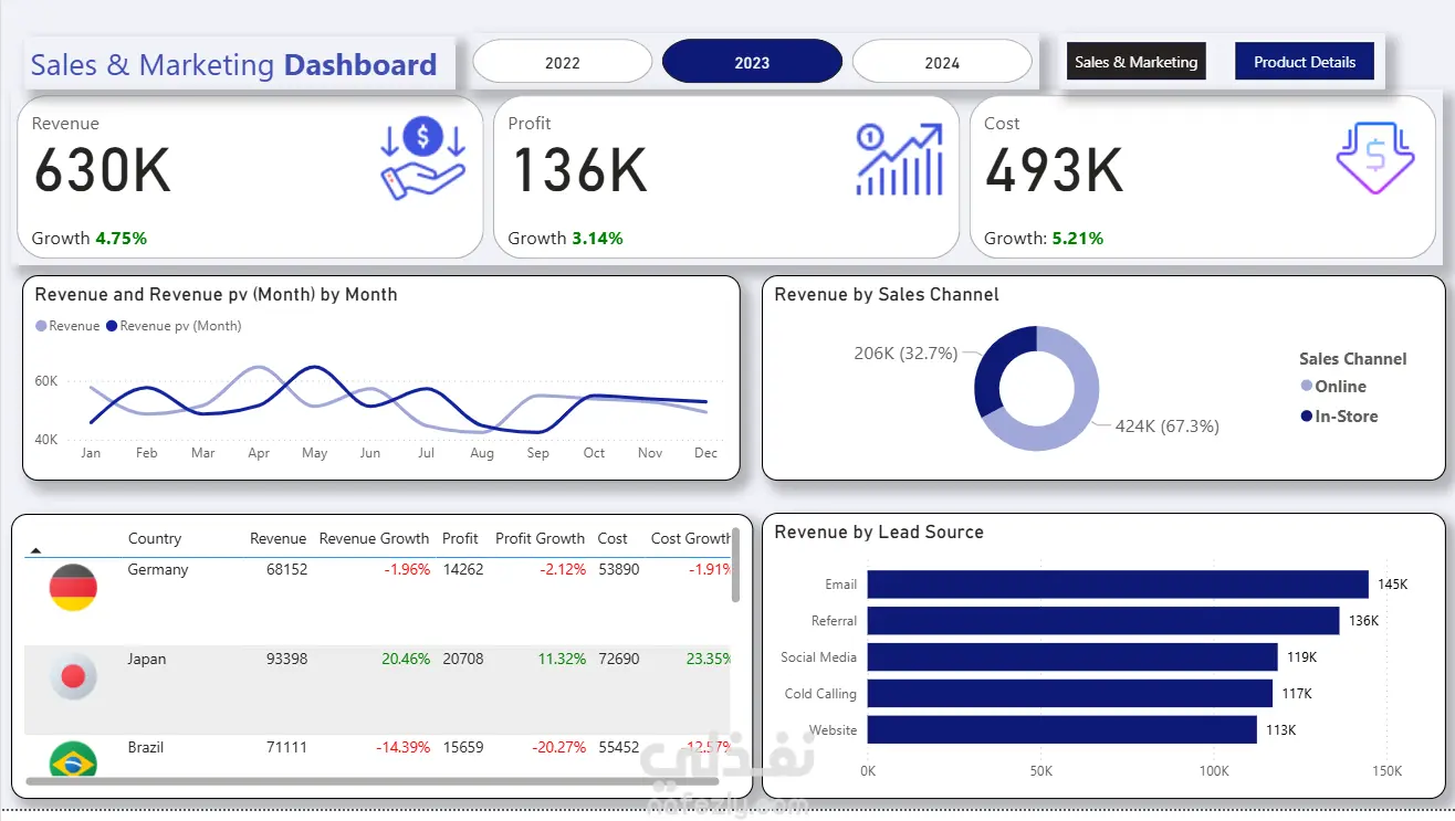 تعرض اللوحة أهم مؤشرات الأداء (KPIs) مثل: الإيرادات، الأرباح، والتكاليف مع مقارنة النمو عبر السنوات، بالإضافة إلى تفاصيل المبيعات حسب الدول، القنوات، والمصادر التسويقية.