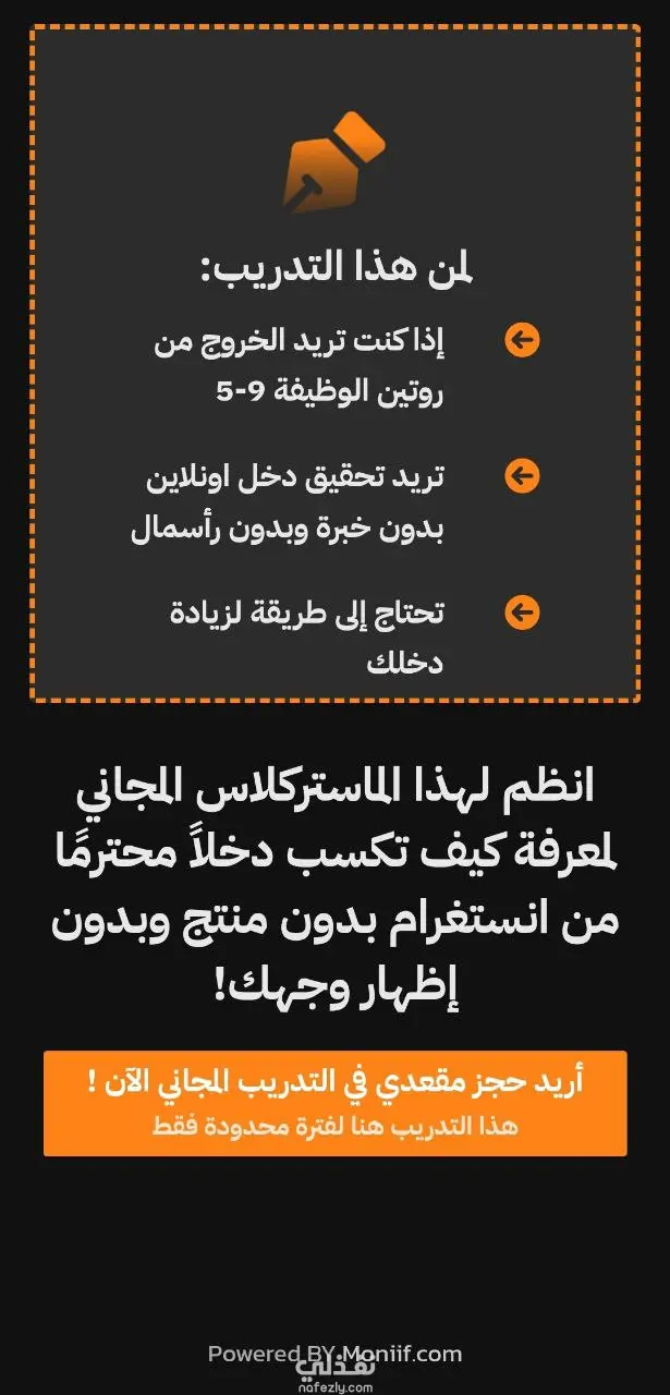 قمت بتصميم صفحة هبوط احادية الهدف (Single-Purpose Landing Page) مبنية على منصة systeme.io تم تصميم الصفحة خصيصا كـ Lead Magnet (أداة لجذب العملاء المحتملين) لحملة اعلانية تهدف إلى جمع بيانات المهتمين بالتدريب المجاني مميزات التصميم وطريقة التنفيذ تصميم مخصص (Custom Theme) تم تصميم ثيم Dark Mode (الوضع المظلم) بالكامل ليتناسب مع هوية العميل مع استخدام اللون البرتقالي الساطع كلون أساسي للفت الانتباه (Accent Color) وتوجيه عين الزائر نحو الأزرار المهمة التركيز على التحويل (CRO) تم ترتيب عناصر الصفحة بشكل استراتيجي تحديد الجمهور البدء بـ لمن هذا التدريب؟ لمخاطبة الفئة المستهدفة مباشرة عرض القيمة الواضح اكسب دخلا بدون إظهار وجهك نداء واضح للعمل (CTA) زر أريد حجز مقعدي بحجم ولون بارز عنصر الندرة استخدام جملة لفترة محدودة فقط لتحفيز الزائر على اتخاذ إجراء فوري تصميم متجاوب تم التأكد من أن التصميم يعمل بشكل مثالي على شاشات الهواتف الذكية (Mobile-First) وهو ما تظهره الصورة المرفقة