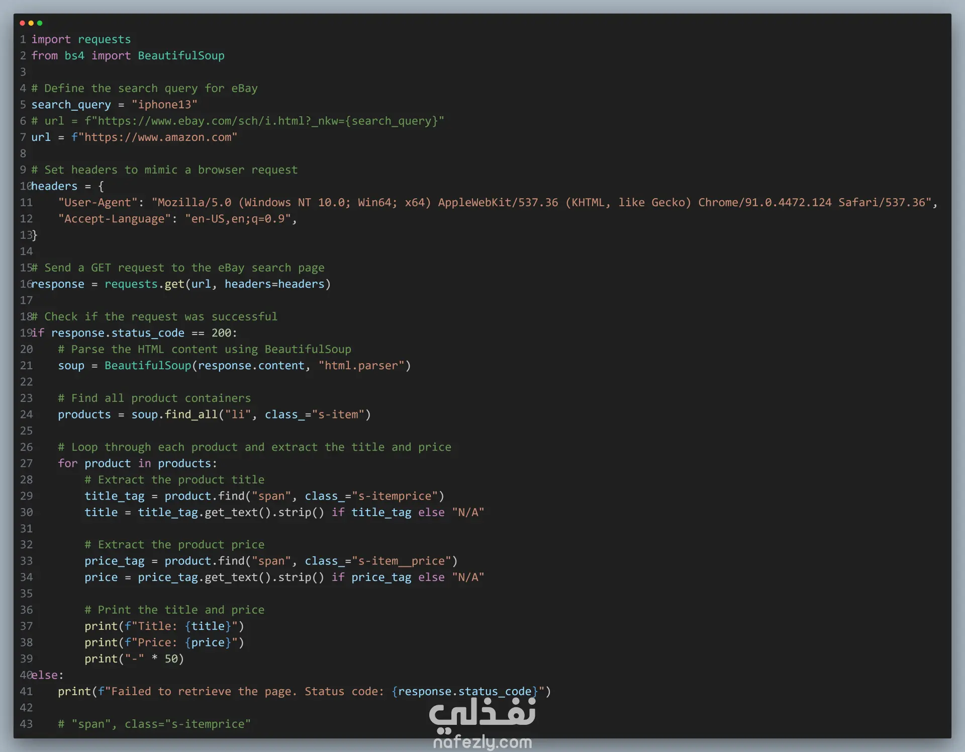 This project is a web scraping tool built with Python, designed to extract product information such as titles and prices from e-commerce websites like eBay and Amazon. 🔹 Features: Sends HTTP requests using the requests library with custom headers to simulate a real browser request. Parses HTML content using BeautifulSoup (bs4). Extracts key product details: Product title Product price Handles HTTP response validation to ensure successful data retrieval. Prints the extracted results in a clean, readable format. 🔹 Technologies Used: Python 3 BeautifulSoup (bs4) for HTML parsing Requests for HTTP communication 🔹 Purpose: This project demonstrates how to use Python for web data extraction and can be extended to: Compare product prices between sites. Build price monitoring or alert systems. Collect product listings for analysis or visualization.
