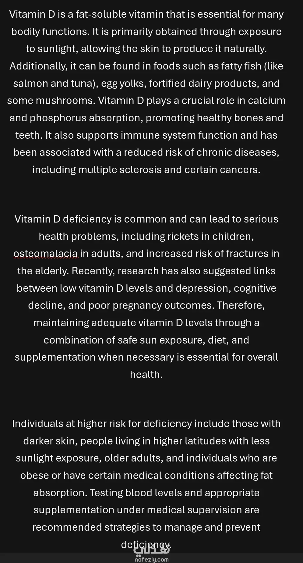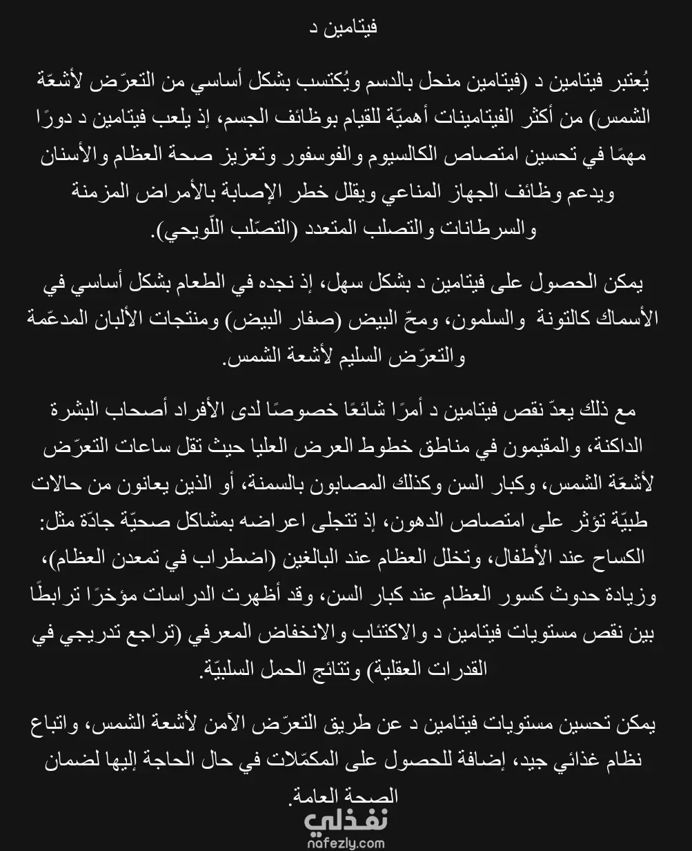 ترجمة شاملة لنص طبي عن فيتامين د - يغطي المصادر، الوظائف، مضاعفات النقص، وطرق العلاج. تمتاز الترجمة بالدقة العلمية في نقل المصطلحات الطبية المتخصصة، مع الحفاظ على سلاسة اللغة ووضوح المعلومة للقارئ العام والمتخصص.