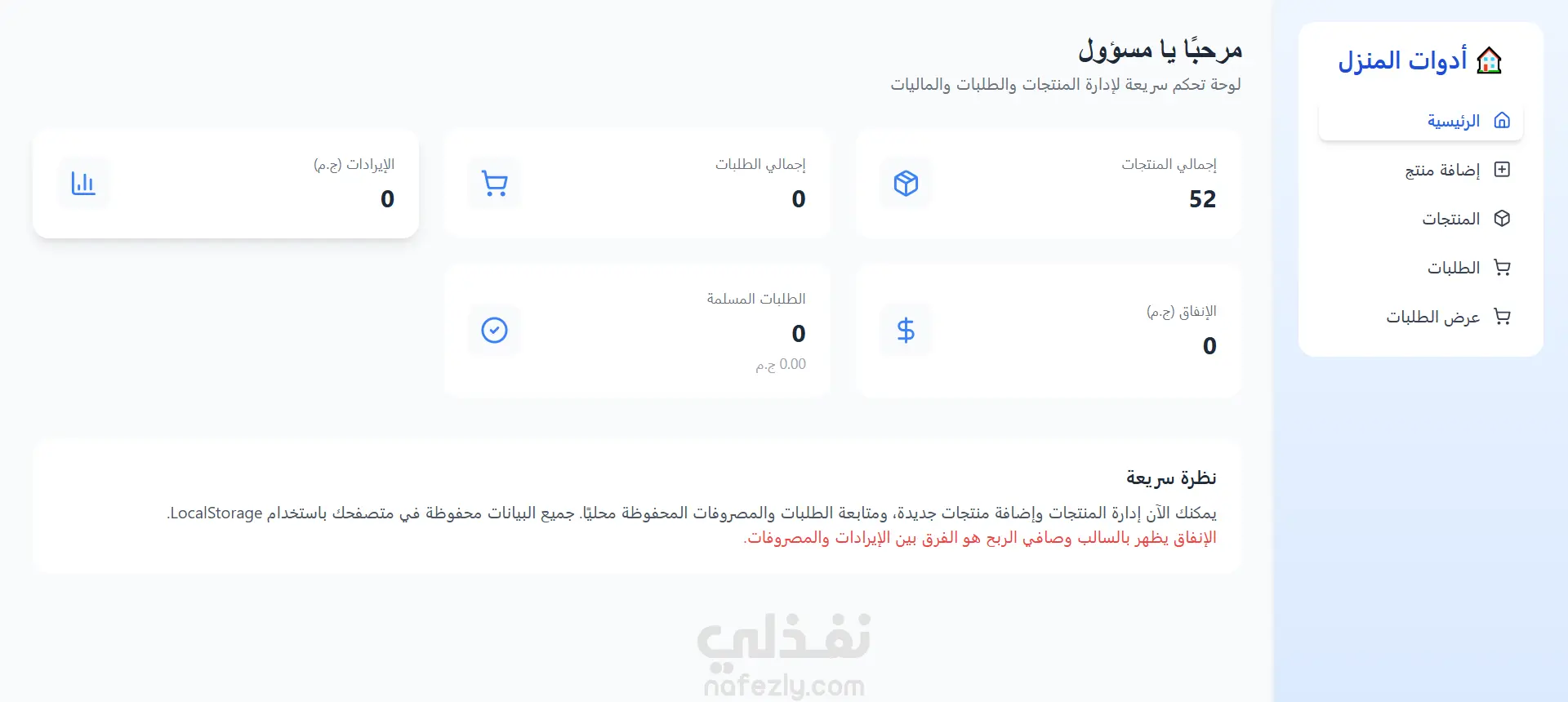 نظام إدارة منتجات وطلبات بسيط مبني بـ React و Tailwind CSS. يمكنك من خلاله إضافة منتجات، تتبع الطلبات، معرفة الإيرادات والمصروفات، وتحديد الطلبات المسلمة. يعتمد على LocalStorage لحفظ البيانات محليًا، ويتميز بواجهة سهلة ومنظمة.