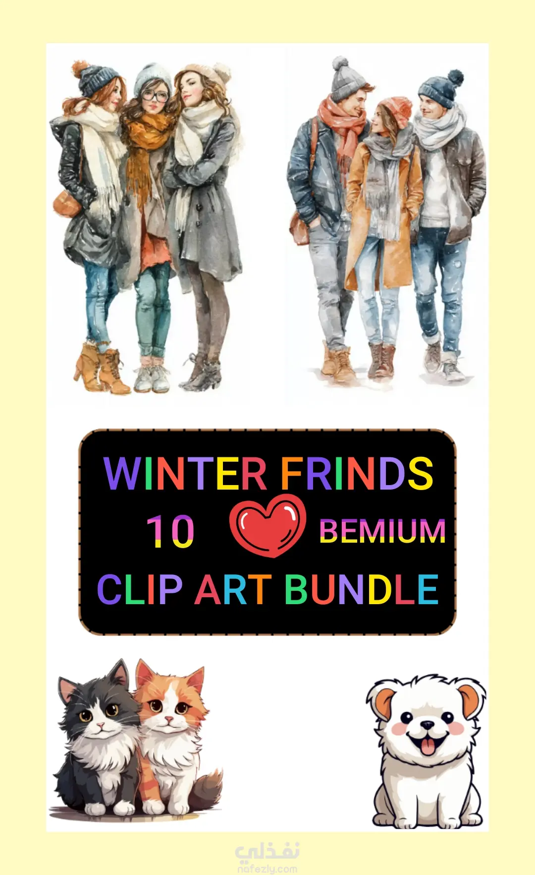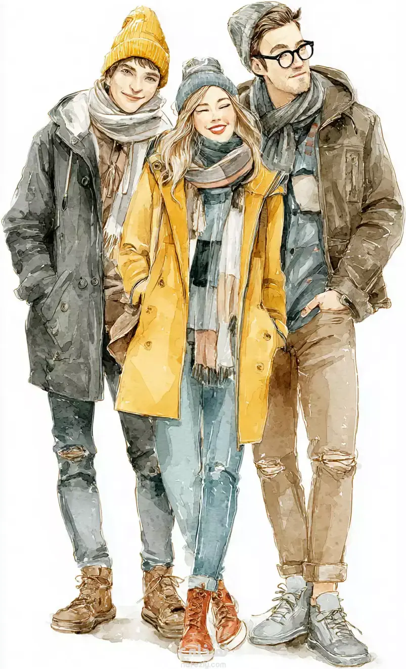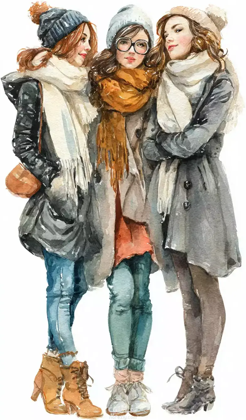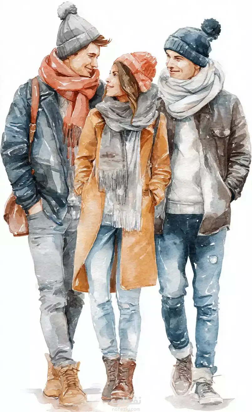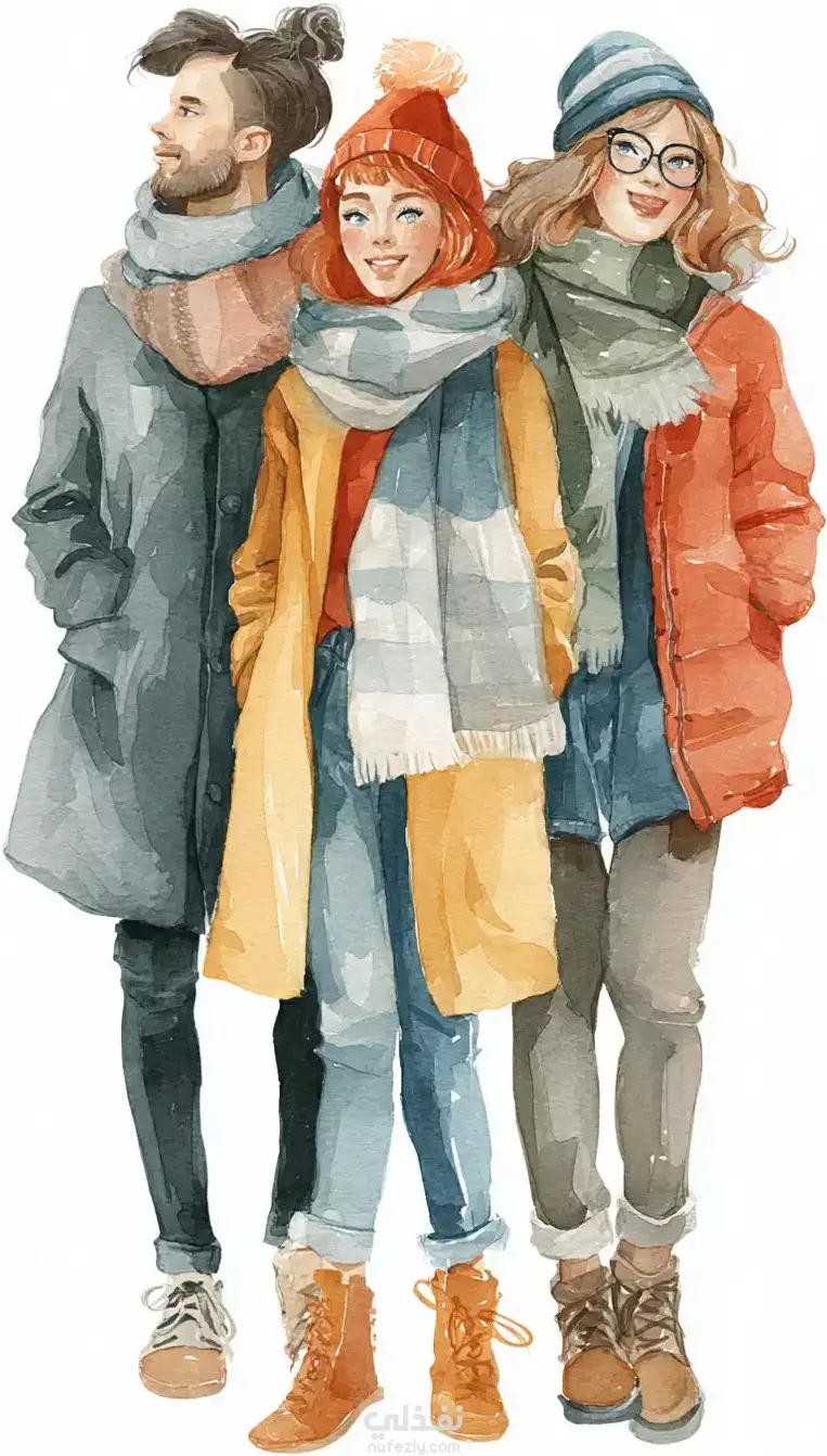 تصميم clip-art لمجموعة من الأصدقاء مصمم بالألوان المائية فى أجواء شتوية