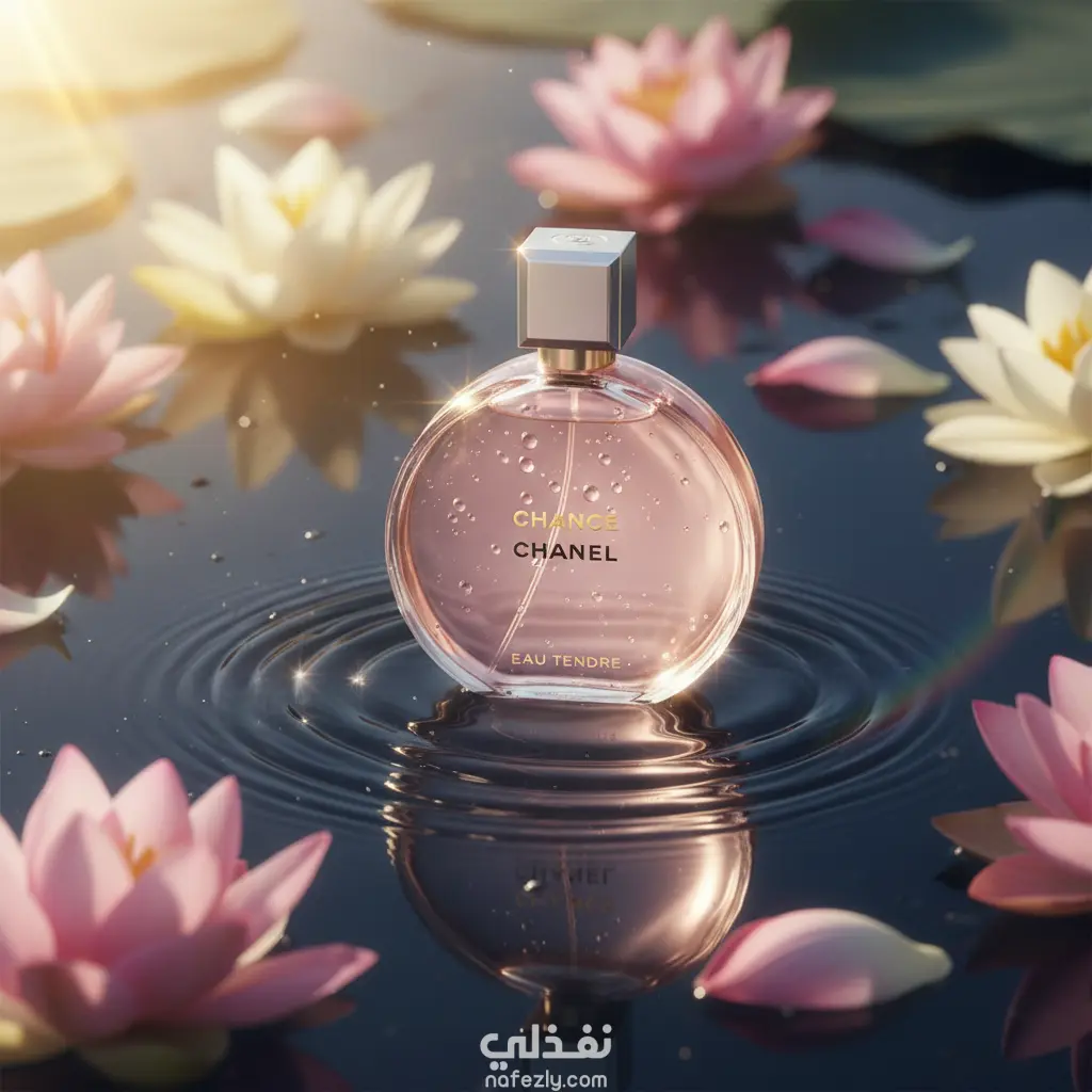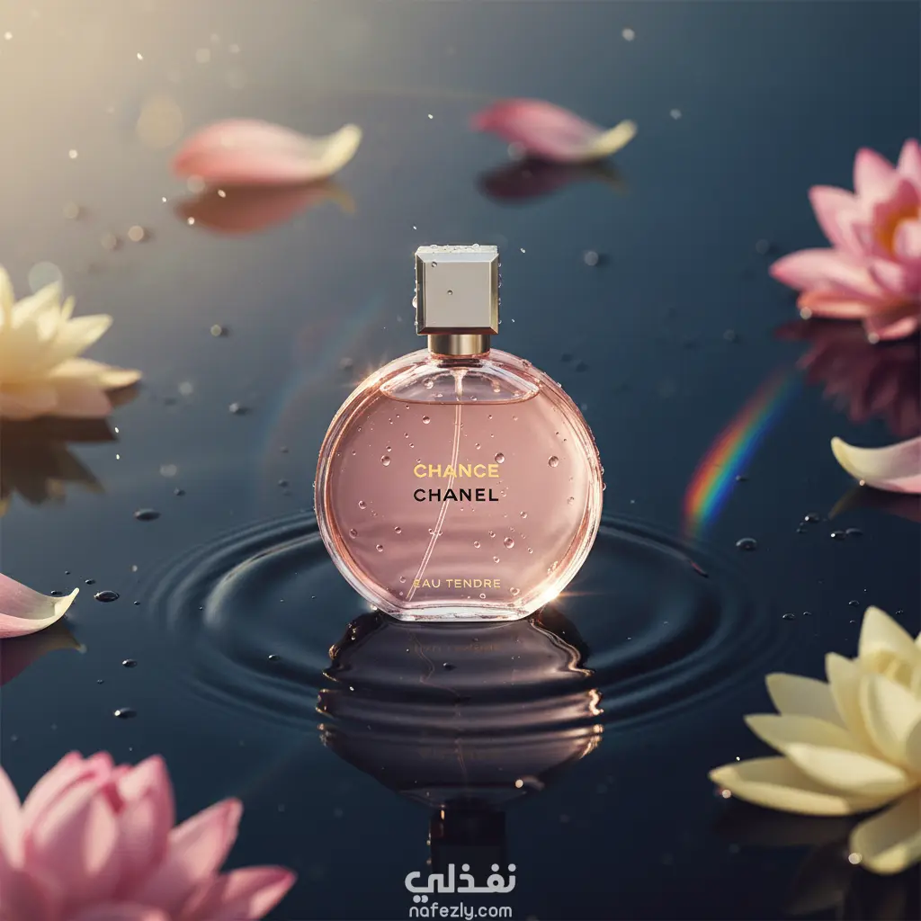 يعرض التصميم زجاجة العطر في المنتصف محاطة بزهور ومؤثرات مائية ناعمة تعكس الإحساس بالانتعاش والأنوثة.