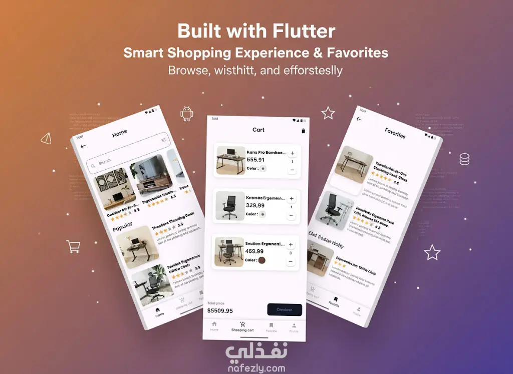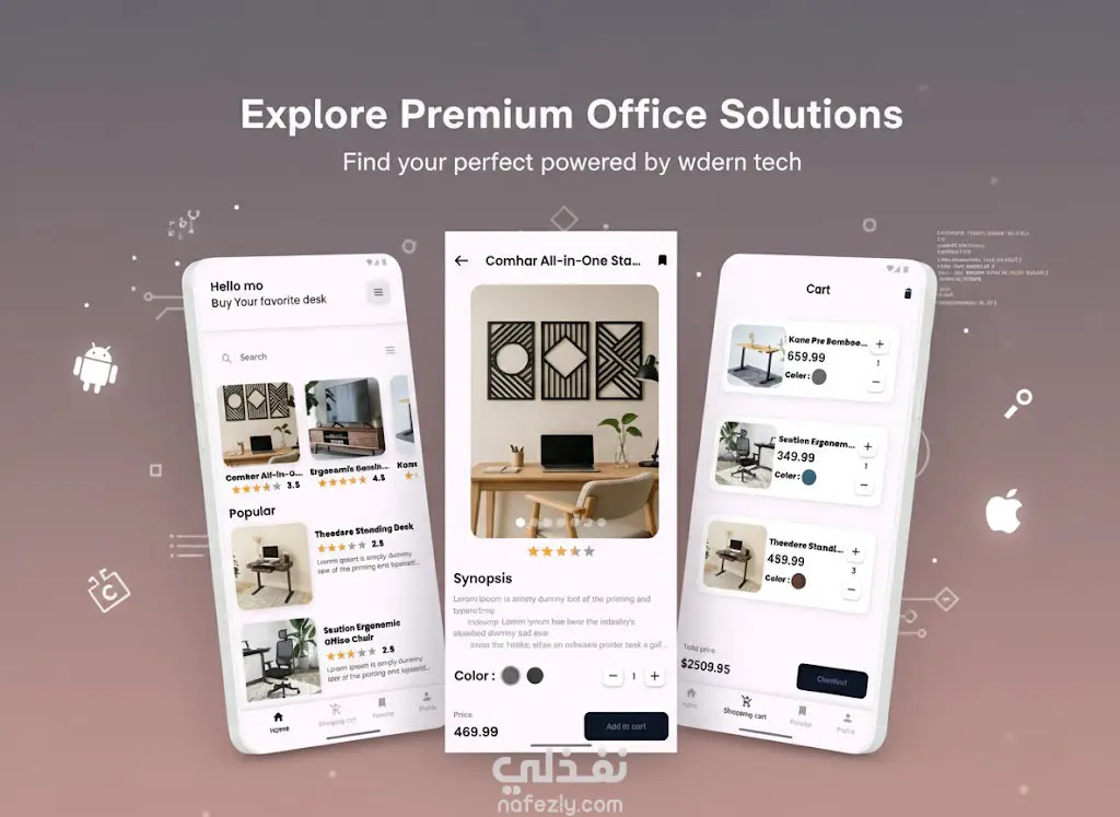 أقدم لكم تطبيق جوال لبيع الأثاث المكتبي، تم تطويره بالكامل باستخدام Flutter (Dart)، لتقديم منصة تجارية رقمية جاهزة تعمل بسلاسة على كل من أجهزة Android و iOS. هذا التطبيق يجمع بين التصميم العصري والجاذب (UI/UX) والأداء القوي، مما يضمن تجربة تسوق سلسة وفعالة للعملاء، ويعكس صورة احترافية لعلامه التجارية.