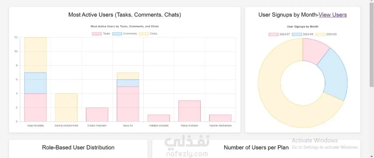 • رؤى مبنية على البيانات: مخططات توضح إحصاءات المستخدمين مثل عدد المشتركين في كل خطة، مما يمنح كلًا من المستخدمين والمديرين رؤية واضحة وقيمة.