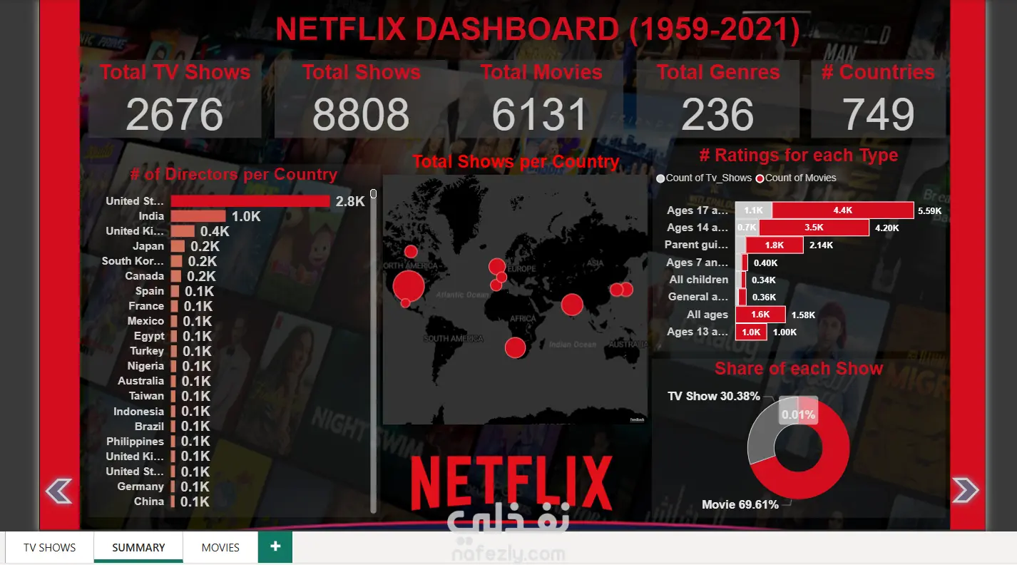 مزيج المحتوى: مخطط حلقي (Donut Chart) يوضح بوضوح حصة الأفلام مقابل حصة المسلسلات التلفزيونية، مسلطاً الضوء على أولويات الاستثمار في المحتوى لـ Netflix.