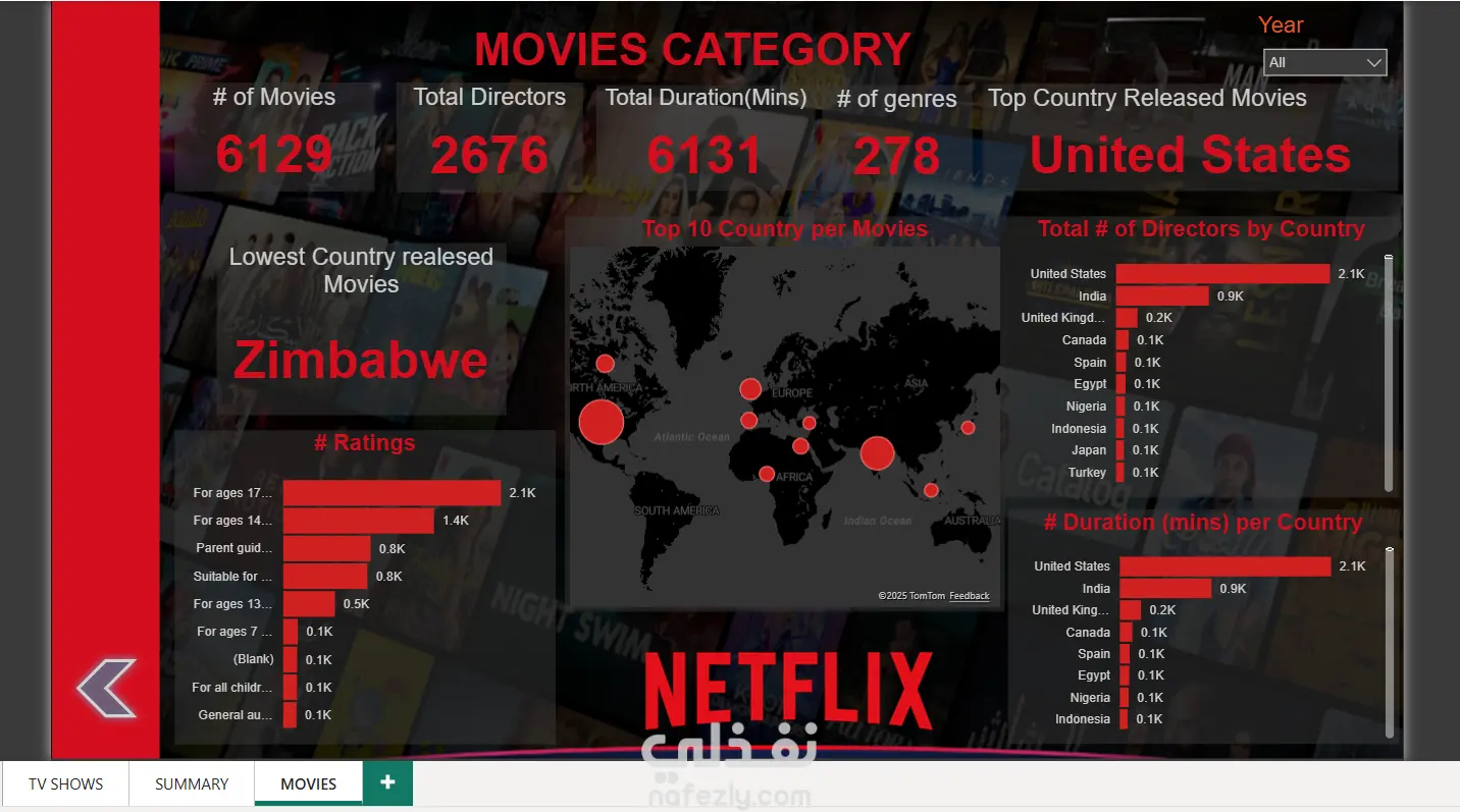 المقاييس الأساسية: تتبع عدد الأفلام، وإجمالي مدة العرض (Duration)، وإجمالي عدد المخرجين.