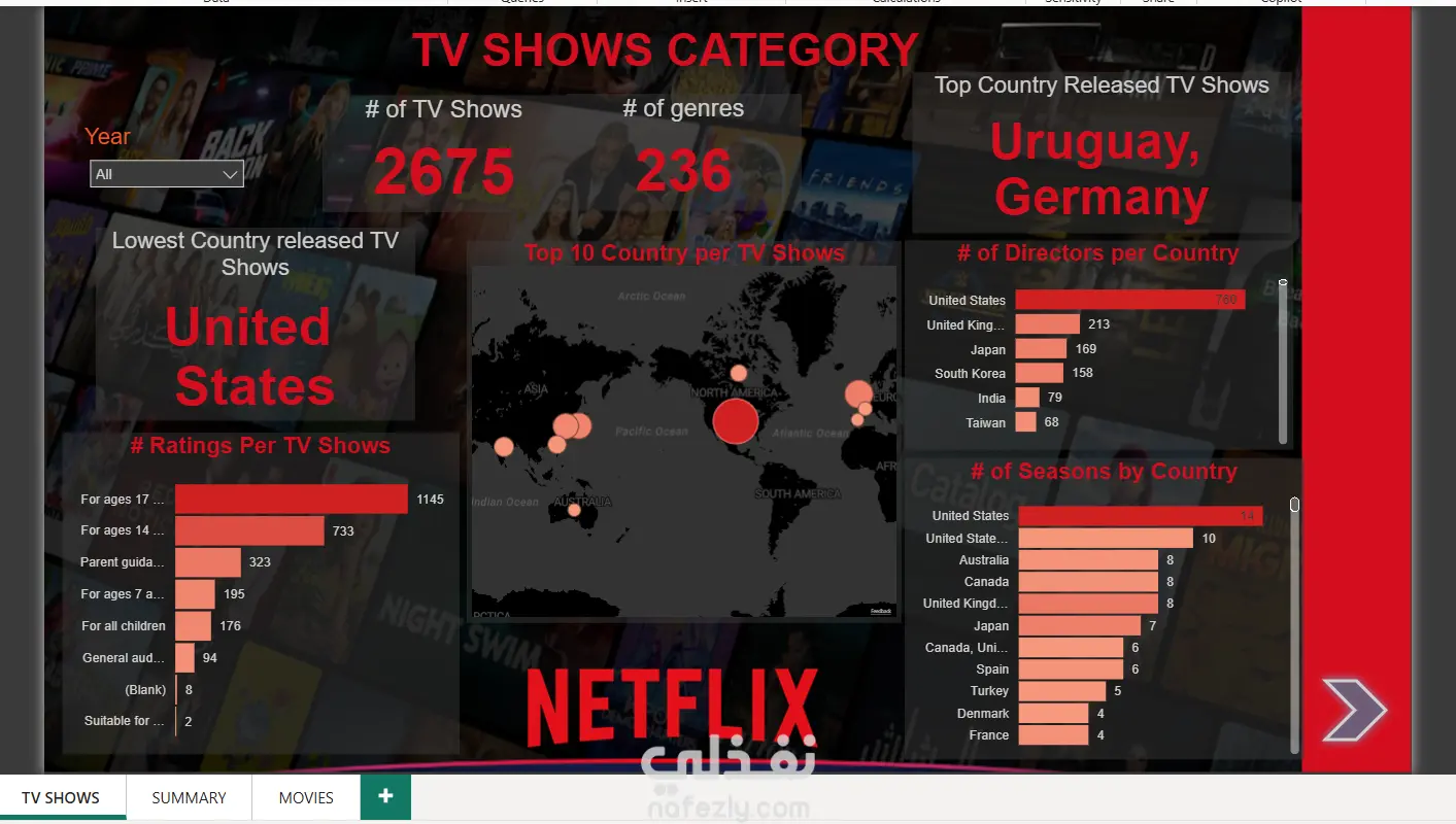 الإنتاج والحجم: بطاقات KPI تتعقب عدد المسلسلات التلفزيونية وعدد الأنواع (Genres) التي تغطيها.