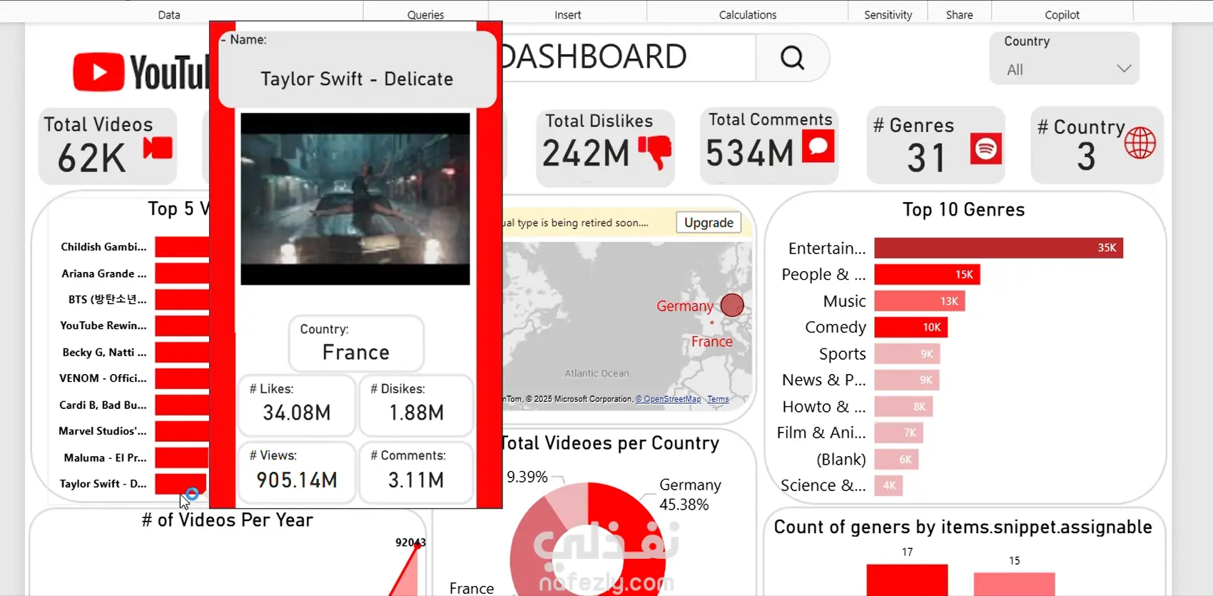 أداة تصفية زمنية متكاملة (Year Slicer): تُمكّن أصحاب المصلحة من إجراء تحليل دقيق للمسلسلات الزمنية عن طريق تصفية جميع مقاييس المحتوى ديناميكياً لتاريخ إصدار محدد. هذه الوظيفة ضرورية لتقييم اتجاهات الإنتاج السنوية وتطور استراتيجية المحتوى.