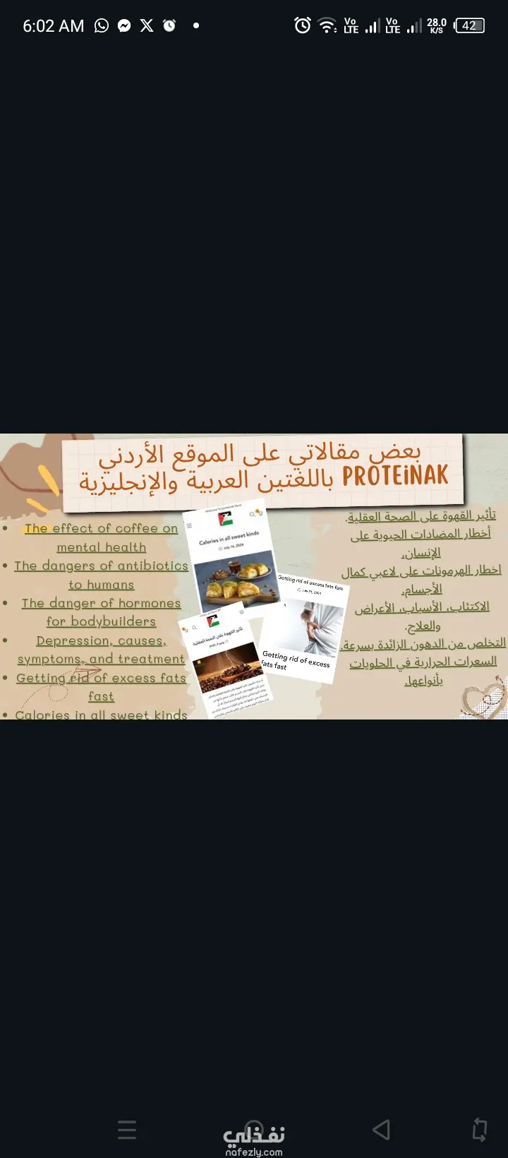 كتابة المقالات مع الالتزام بقواعد SEO، ورفعها على ووردبريس أو تسليمها Word أو Google docs. مرفق البورتفوليو الخاص بي مع لينكات مباشرة للمقالات المنشورة على مواقع مختلفة ومعروفة. سعر الخدمة ٦دولارات للمقال بدون رفع، و٨ دولارات بالرفع.