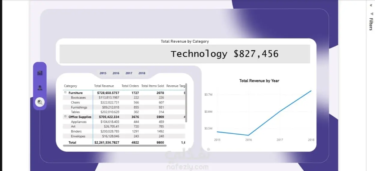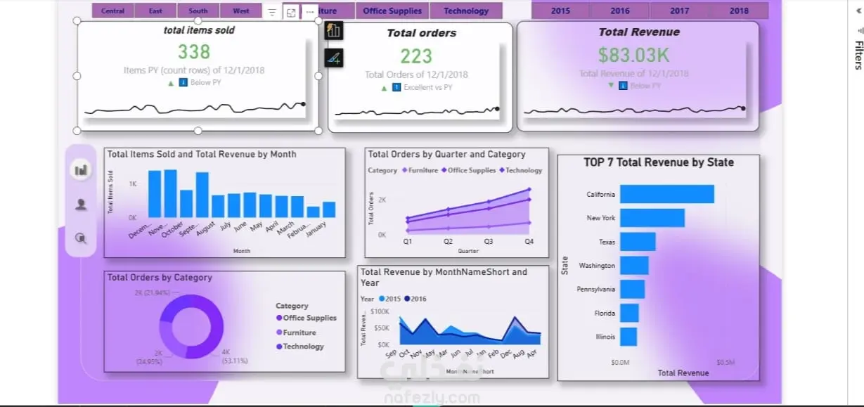 تم تنفيذ مشروع لوحة تحكم تفاعلية باستخدام Power BI لعرض وتحليل بيانات المبيعات والإيرادات عبر عدة فئات ومنتجات وفترات زمنية. اللوحة تُمكّن الإدارة من تتبع الأداء المالي بدقة من خلال مؤشرات تفاعلية تشمل: إجمالي الإيرادات حسب الفئة (الأثاث، الأدوات المكتبية، التكنولوجيا). عدد الطلبات والعناصر المباعة حسب السنة والربع الزمني. تحليل الإيرادات حسب المدينة والولاية لتحديد الأسواق الأعلى أداءً. مقارنة الإيرادات بالأهداف المحددة بشكل مرئي عبر الرسوم البيانية والخطوط الزمنية. تحليل الإيرادات حسب نوع العميل (مستهلك – شركة – مكتب منزلي). استخدمت في التصميم الألوان البنفسجية والزرقاء لتمييز الفئات المختلفة وتحسين تجربة العرض البصري، مع استخدام مخططات Treemap، Pie Charts، وLine Charts لعرض البيانات بطريقة سهلة وواضحة.