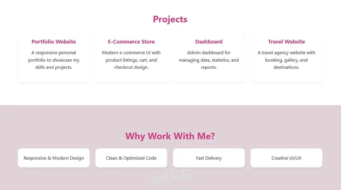 قسم "الأعمال" (Projects): بطاقات Projects تفاعلية مع تأثير hover أو عرض التفاصيل عند الضغط.