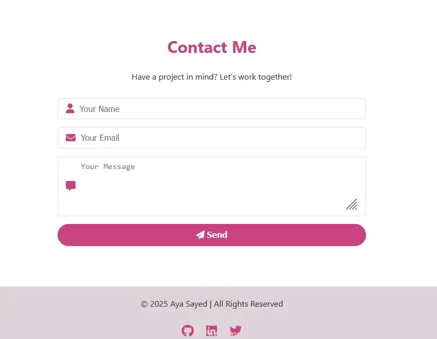 قسم "التواصل" (Contact): نموذج تواصل بسيط (باستخدام JavaScript للتحقق من المدخلات) وروابط حساباتي على السوشيال ميديا.
