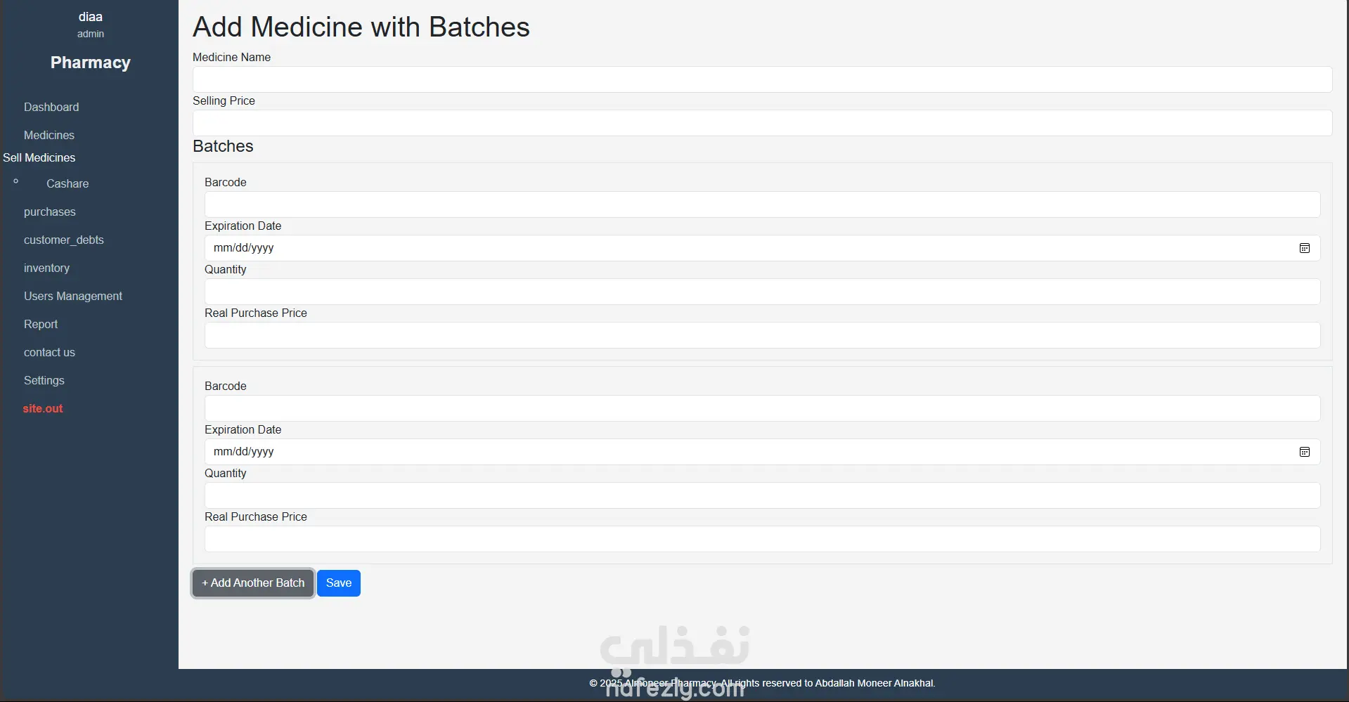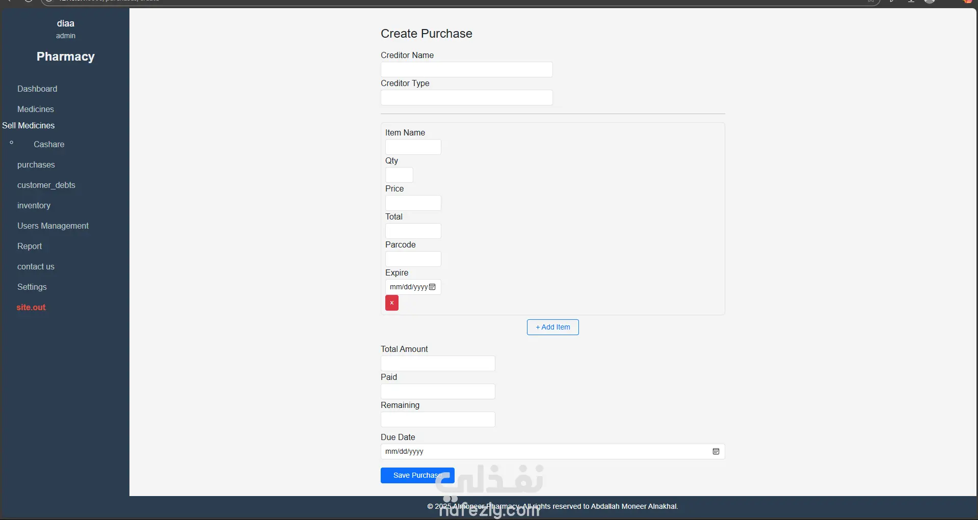 إضافة فاتورة شراء تحتوي على عدة أدوية مع تفاصيل المورد والمبلغ المتبقي، وربطها بالمخزون تلقائيًا.