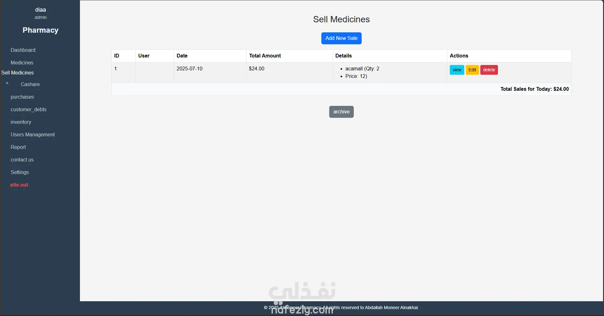 نظام متكامل لإدارة الصيدليات تم تطويره باستخدام Laravel وPHP Desktop، يهدف إلى تسهيل عمليات البيع والشراء وإدارة الأدوية والمخزون، مع توفير تجربة استخدام مرنة وسلسة مناسبة لجميع مستويات المستخدمين، من الصيادلة إلى المحاسبين.